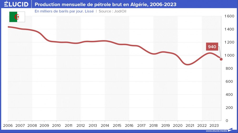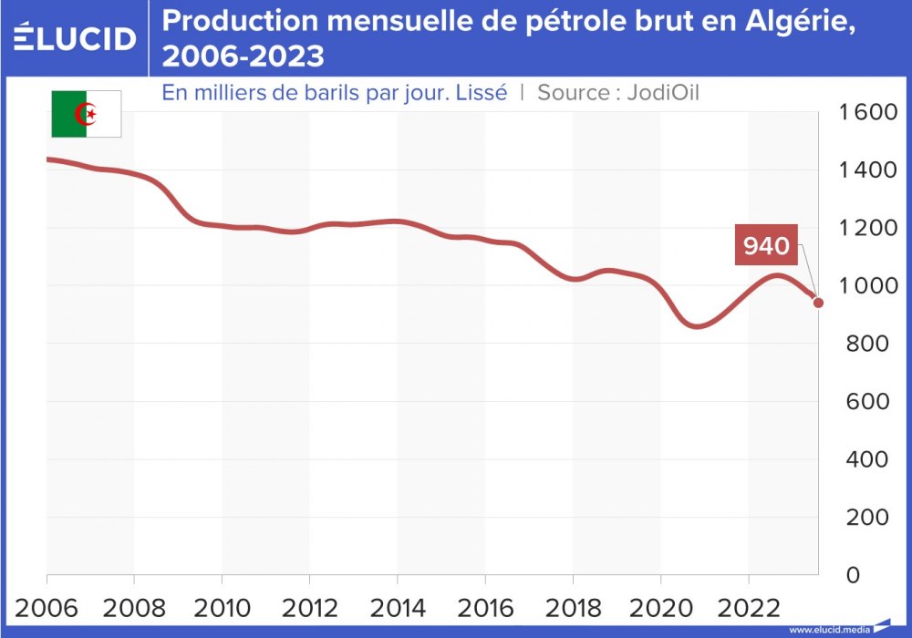Cette tendance structurelle s’explique par l’épuisement des gisements pétroliers actuellement exploités en Algérie, ainsi qu'au manque de nouvelles découvertes. Selon un rapport du Shift Project basé sur les données du consultant Rystad Energy, l’Algérie aurait épuisé près de 80 % de ses réserves de pétrole disponible. Même en intégrant le potentiel de découvertes futures – estimé selon le rapport à 4 milliards de barils – l’Algérie a d’ores et déjà épuisé 70 % du pétrole extractible présent dans son sous-sol. Selon toute vraisemblance, le déclin de la production pétrolière devrait donc se poursuivre dans les années à venir.