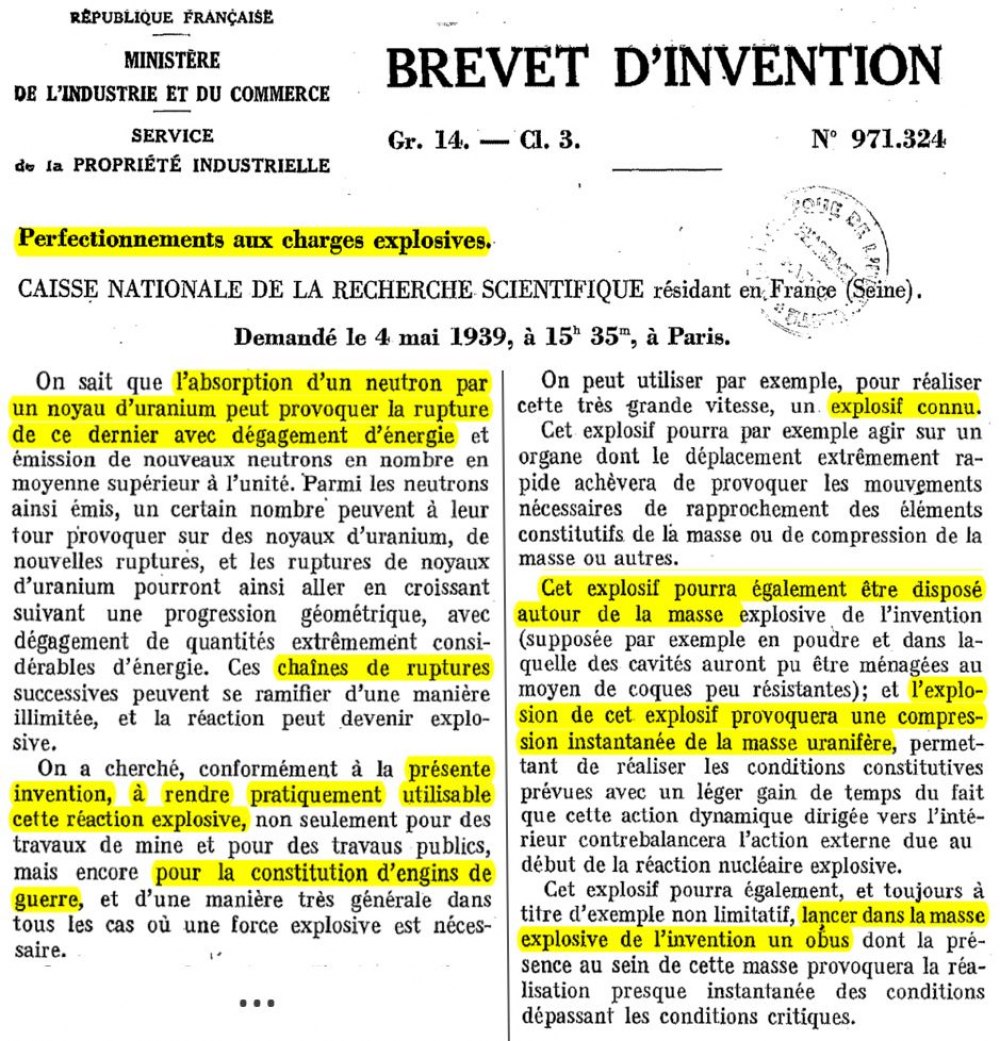 Le premier brevet mondial concernant une bombe nucléaire déposé par la CNRS en 1939.