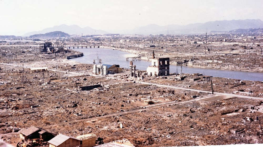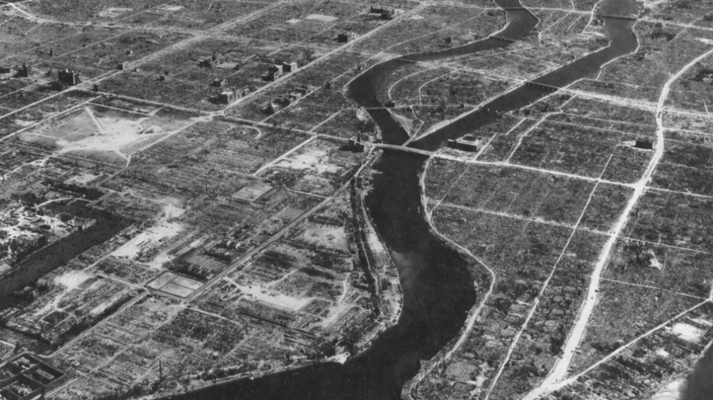Le dôme de Genbaku, seul bâtiment à être resté debout près du point zéro de l’explosion (à droite, le pont en T était la cible du bombardier)