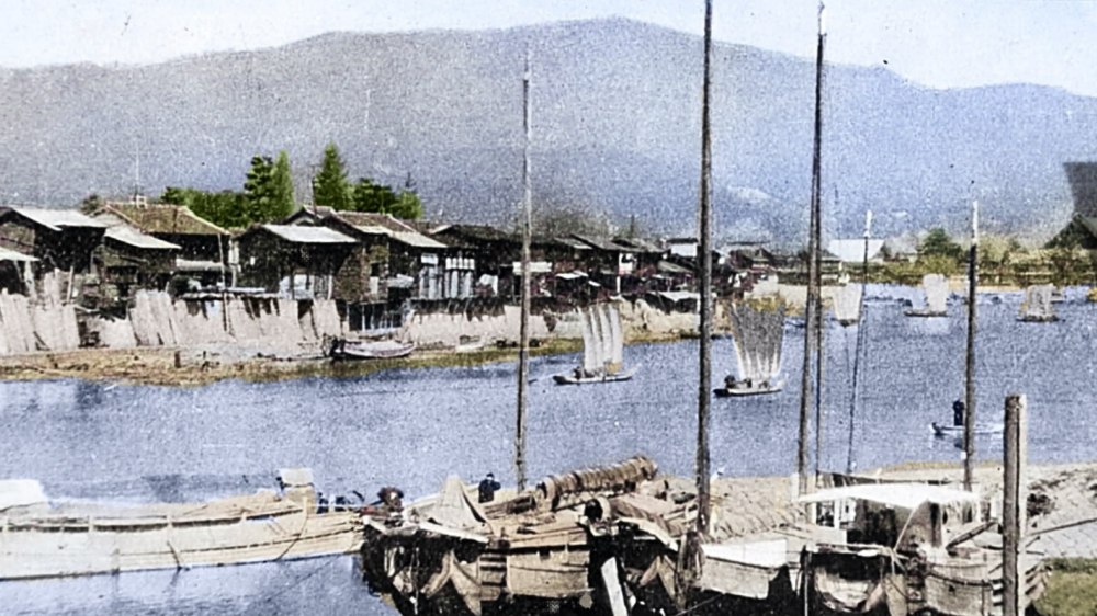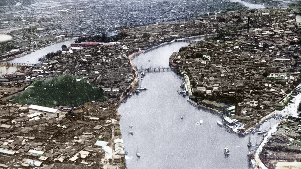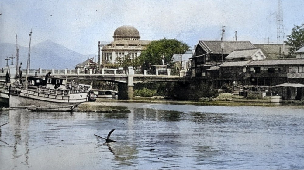Vue vers le nord depuis le pont d'Aioi (la cible de la bombe atomique). Des maisons en bois bordent les rives de la rivière Ota, devant lesquelles s'alignent des bateaux fluviaux japonais traditionnels.
