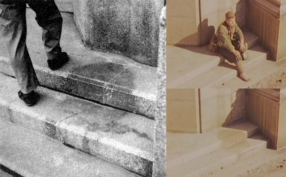 Ombre humaine sur les marches de la banque Sumitomo à Hiroshima en décembre 1946 et reconstitution