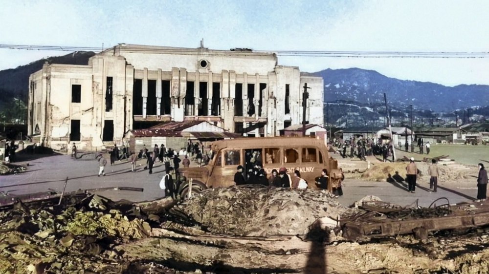 Des citoyens se rassemblent devant les ruines de la gare d'Hiroshima plusieurs mois après le bombardement atomique.