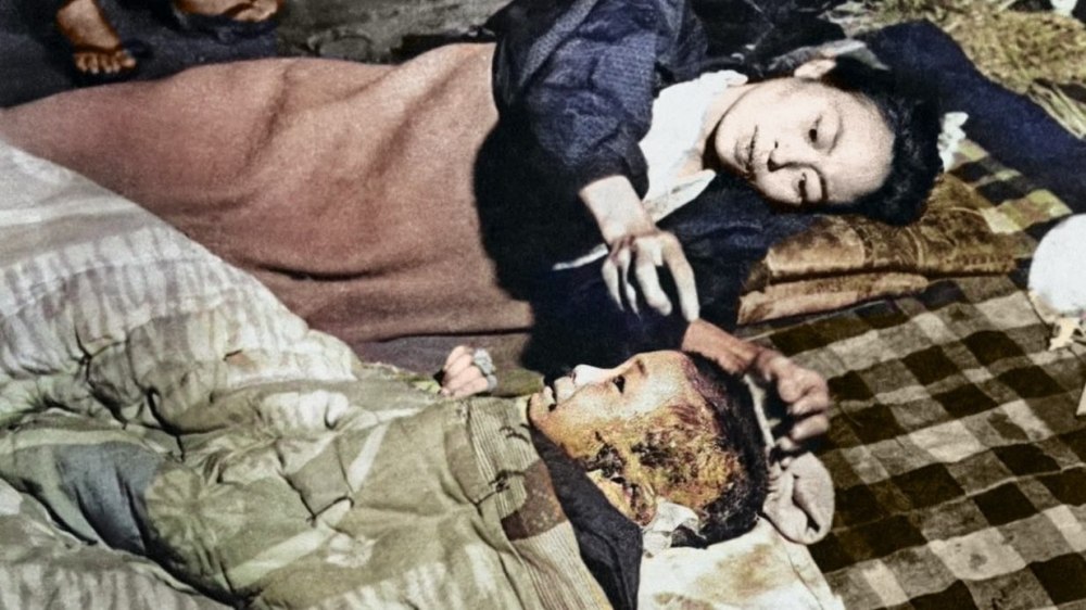 Une femme japonaise et son enfant, victimes du bombardement atomique d'Hiroshima, le 6 octobre 1945, sont allongés sur le sol d'une banque transformée en hôpital