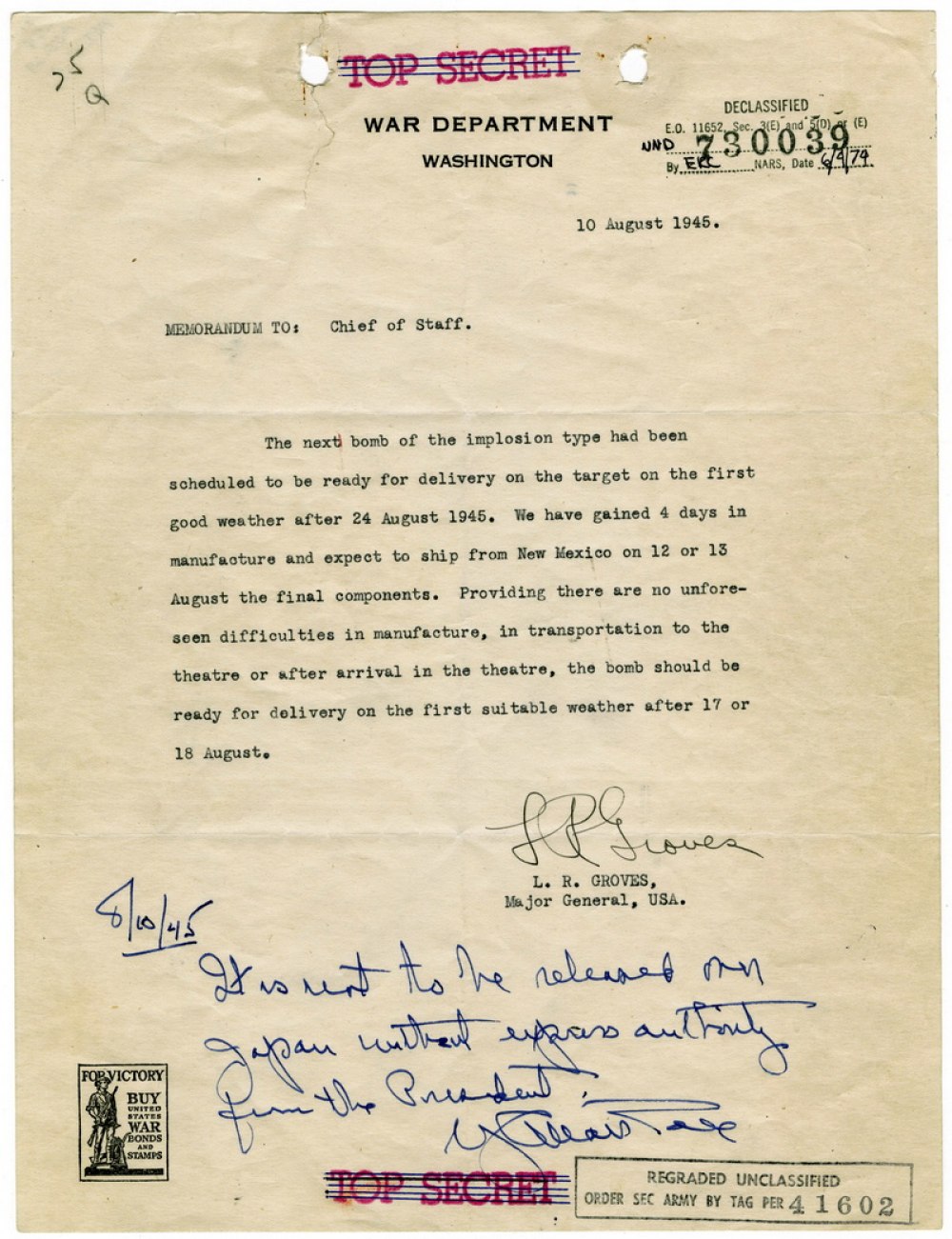 10 août 1945 : le général Leslie Groves, qui dirige le projet Manhattan, informe le général George Marshall, chef d'état-major de l'armée, que la prochaine bombe atomique pourra être lancée le 17 ou le 18 août. Marshall lui répond qu'elle ne devra pas être larguée sur le Japon sans l’autorisation expresse du président Truman - National Archives.