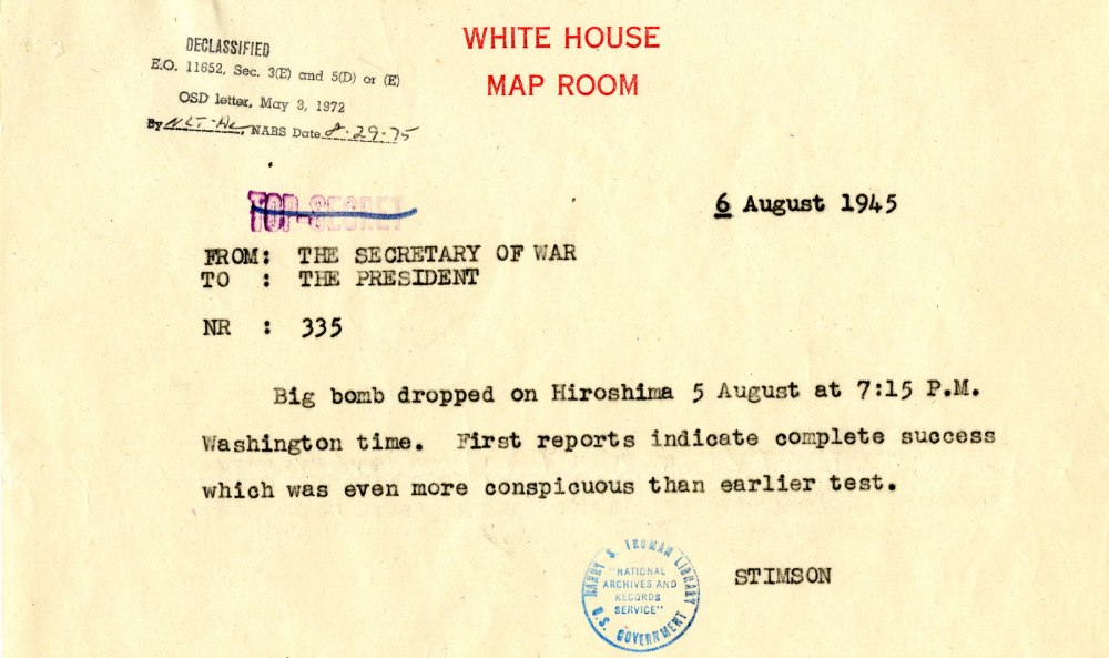 6 août 1945 : message d'information au Président Truman du "succès complet" du bombardement, "encore plus éclatant" que le test Trinity - National Archives.