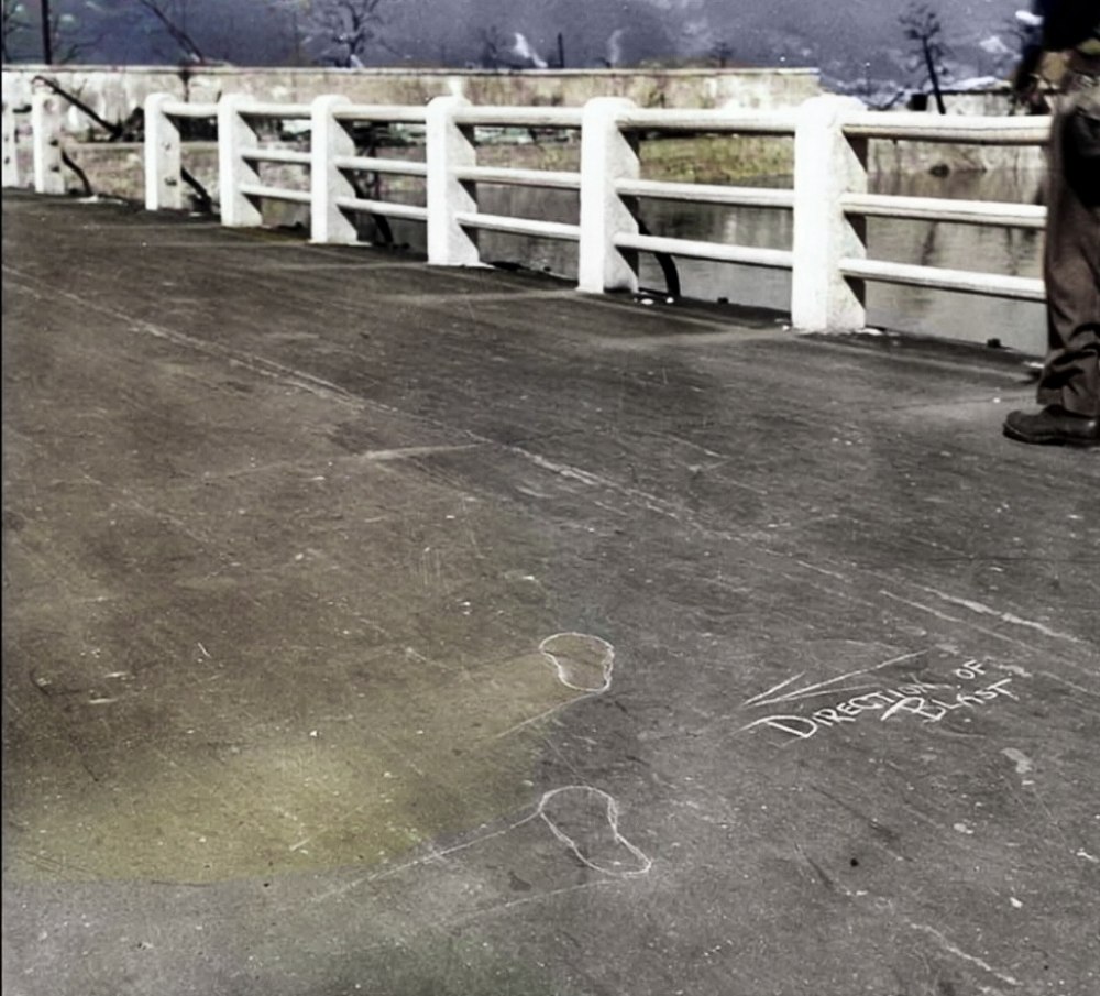 Ombre blanche d'un homme sur le pont Yorozuyo d'Hiroshima (situé à 860 m de l'explosion) - National Archive
