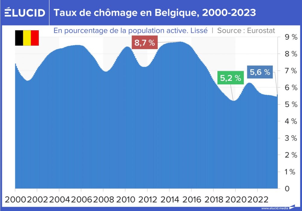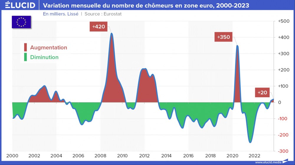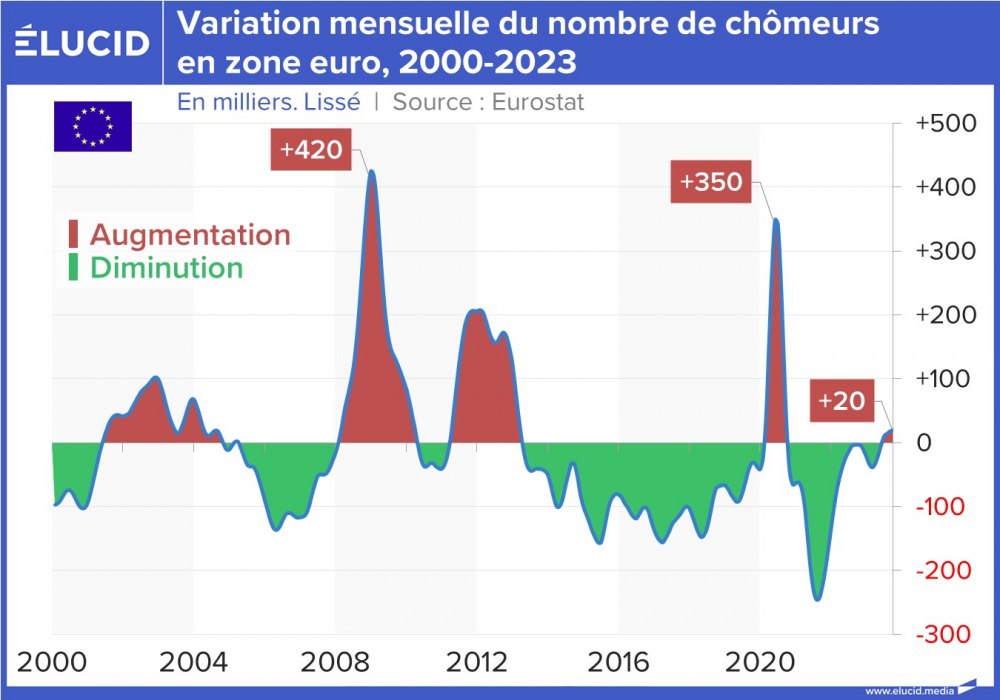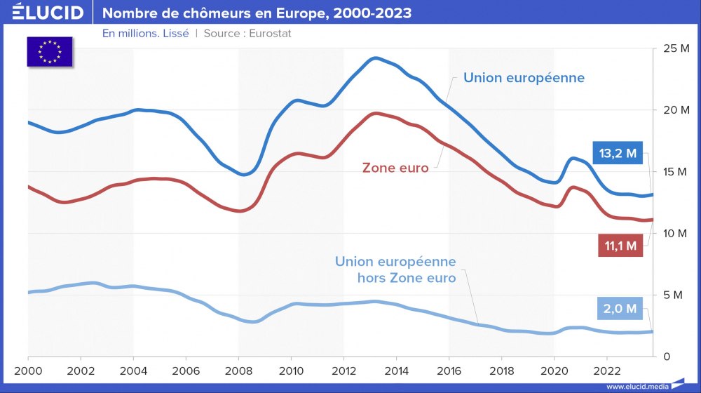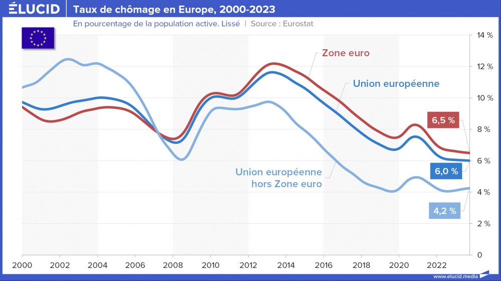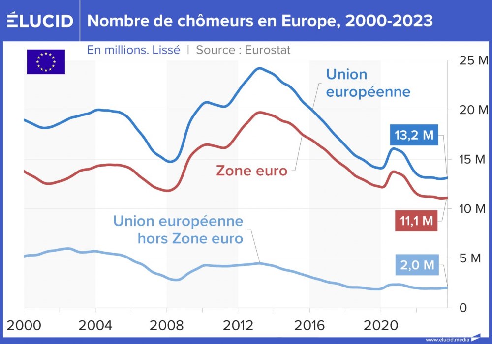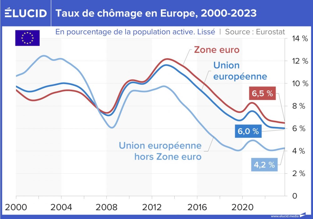 Sur les deux dernières décennies, le chômage en Europe a connu 3 périodes marquantes :
