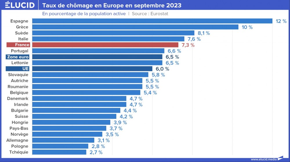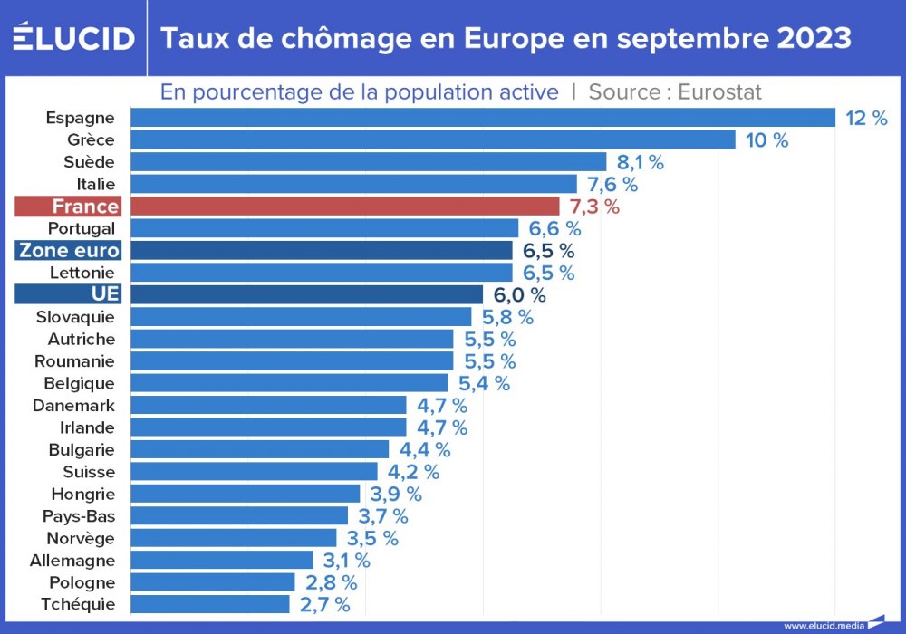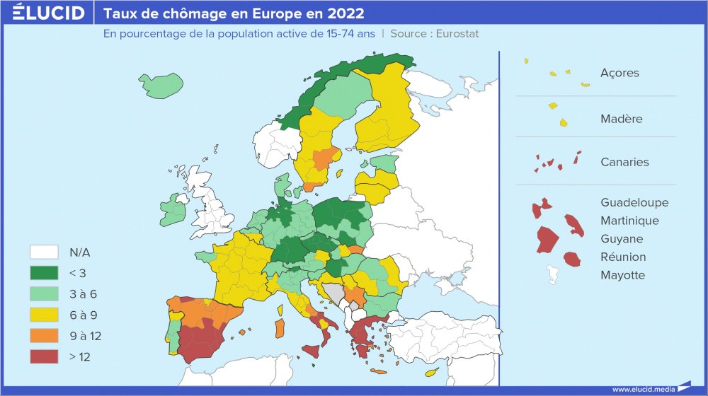 L'année 2022 a cependant marqué la fin de l’embellie et le chômage vient de se remettre à grimper en Europe, certes de façon très inégale. Le cœur industriel de l’Union (Allemagne, Pologne, Tchéquie, Hongrie…) est un havre de plein emploi, tandis que les pays désindustrialisés de la périphérie restent fortement frappés par le chômage (Espagne, Grèce, Italie du Sud…).