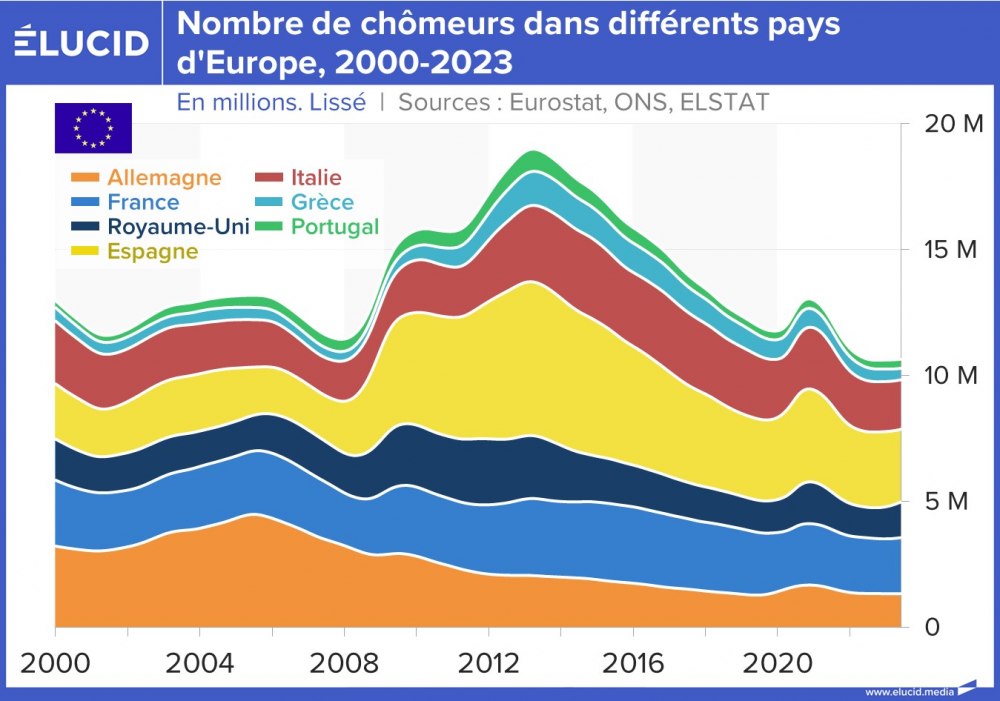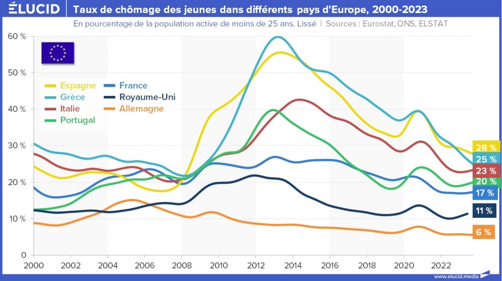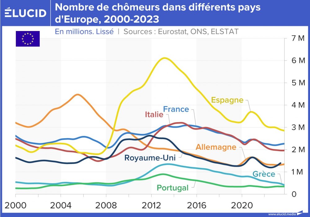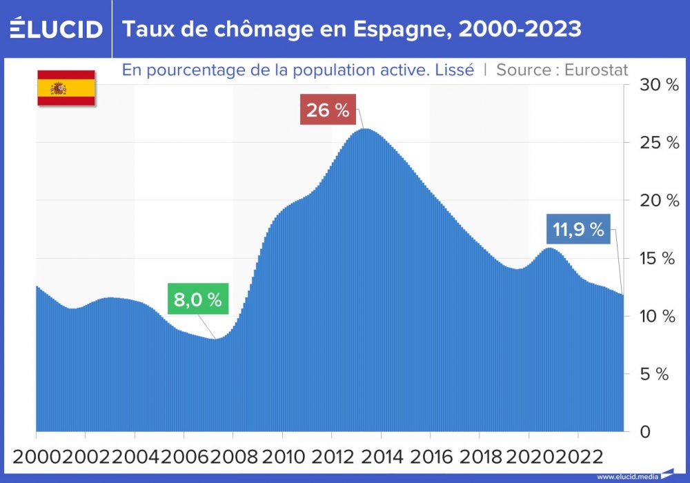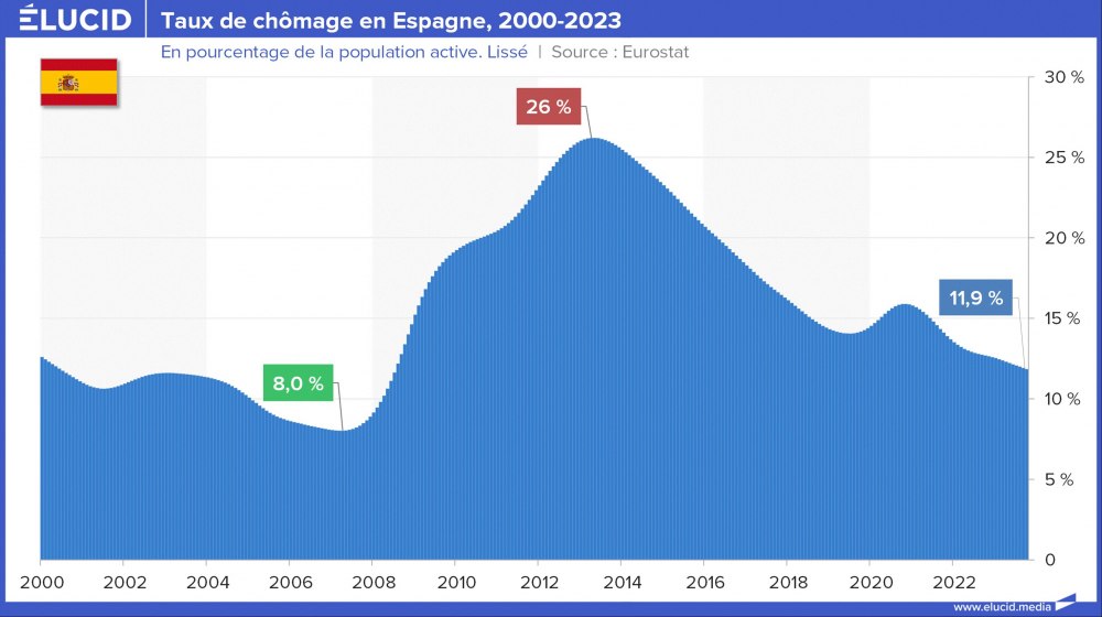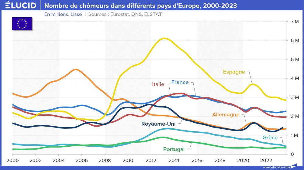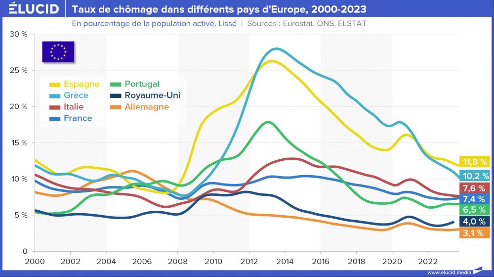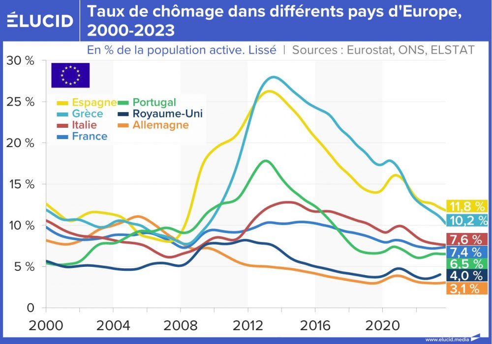 La situation s’est grandement améliorée depuis 10 ans, et ces deux pays affichent désormais un taux de chômage toujours élevé mais divisé par deux, situé entre 10 % et 12 %. Cependant, contrairement à leurs partenaires européens, ces pays sont encore loin d’avoir retrouvé leur niveau de chômage de 2007 (qui était d’environ 8 %).