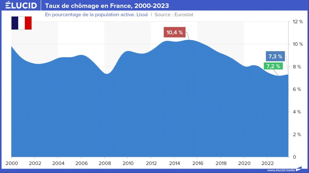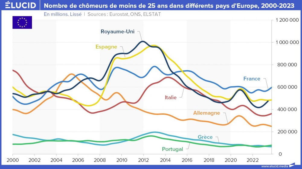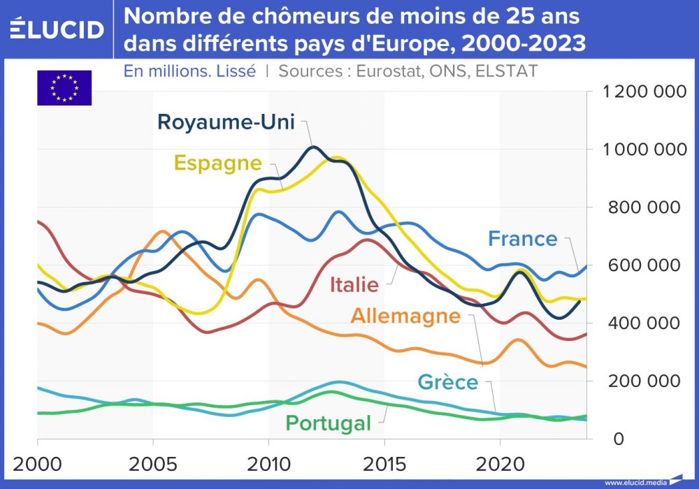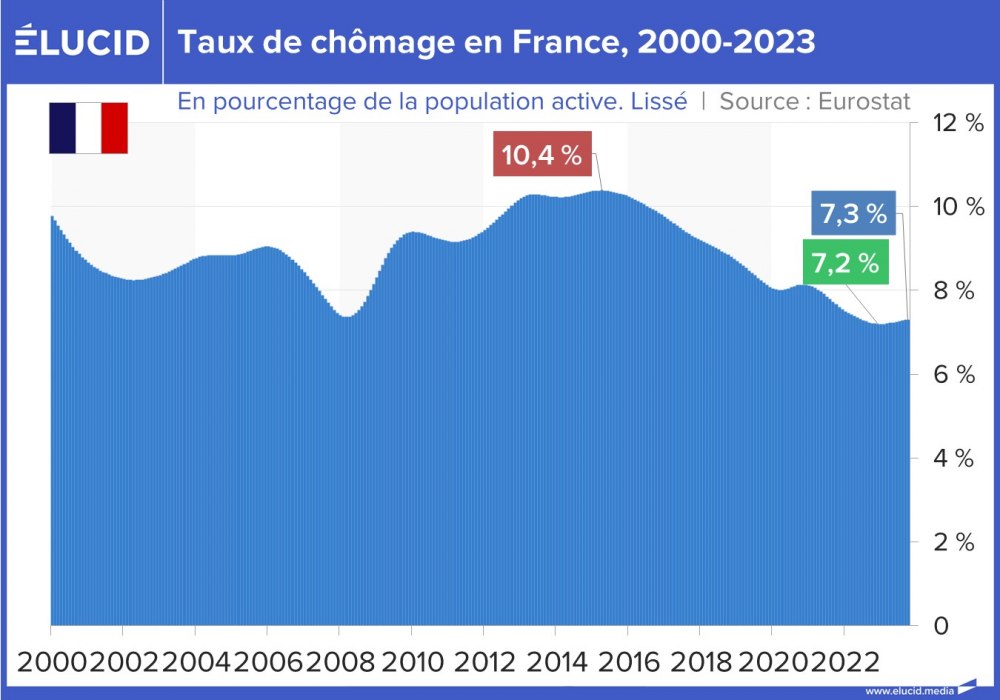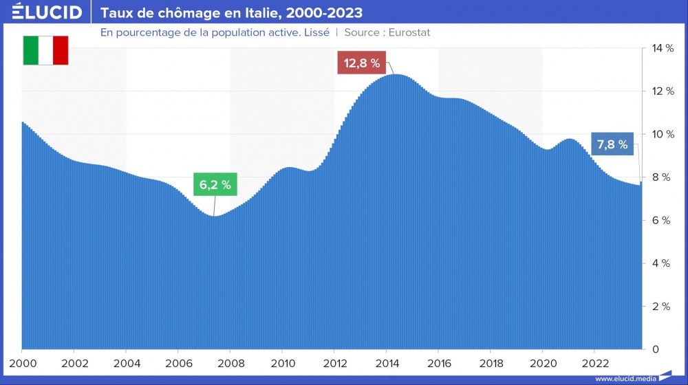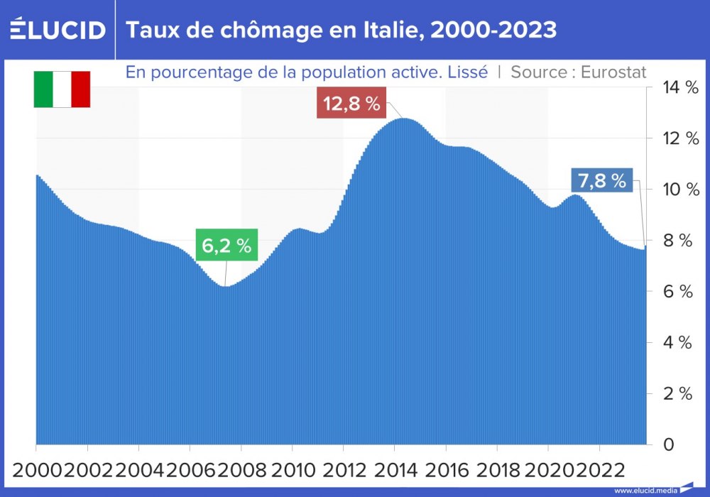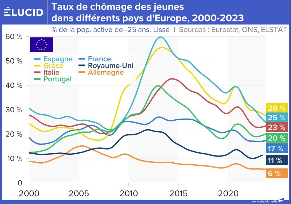 La situation s’est grandement améliorée depuis 10 ans, et ces deux pays affichent désormais un taux de chômage toujours élevé mais divisé par deux, situé entre 10 % et 12 %. Cependant, contrairement à leurs partenaires européens, ces pays sont encore loin d’avoir retrouvé leur niveau de chômage de 2007 (qui était d’environ 8 %).