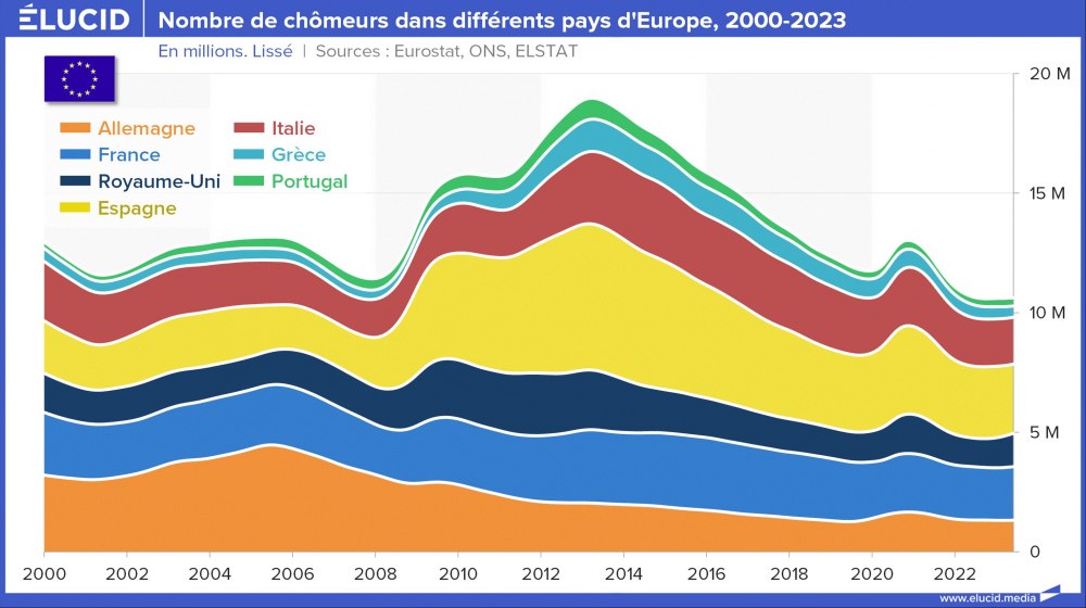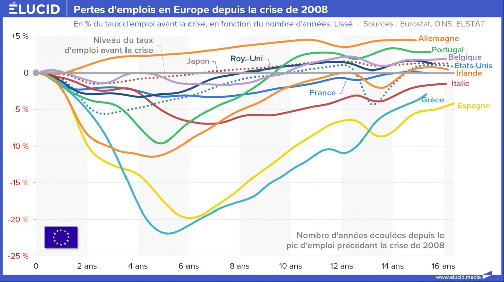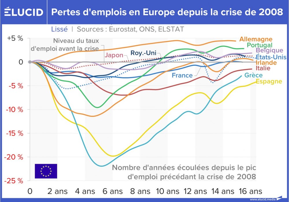 Le graphique de synthèse ci-dessous permet de distinguer clairement quels pays ont été les plus impactés par la crise de 2008 sur le plan du chômage et comment ils se sont rétablis. L’Espagne, la Grèce et l’Italie sont les principaux pays à ne pas avoir retrouvé leur taux de chômage d’avant la crise de 2008.