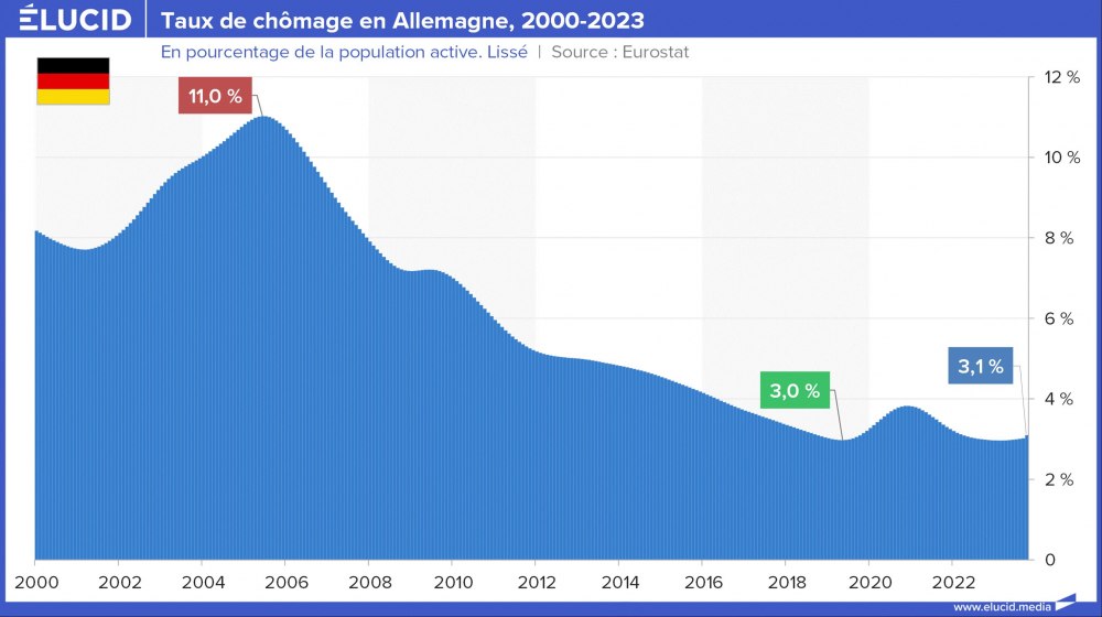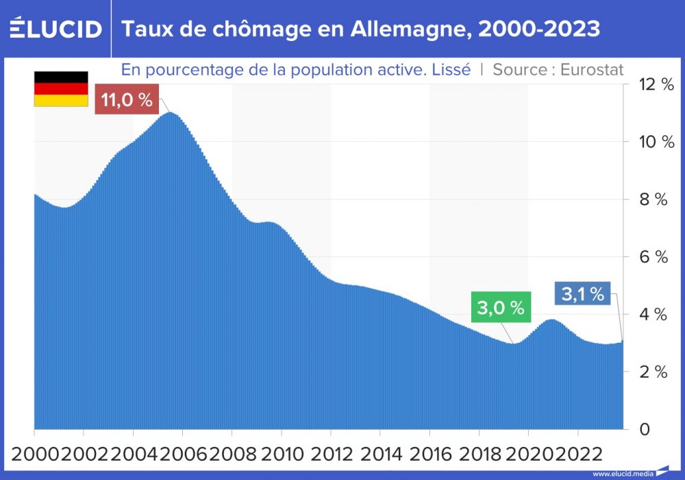 L’Allemagne a été exceptionnellement épargnée par la montée du taux de chômage à la suite de la crise de 2008. Début 2007, le pays enregistre un taux de chômage de 10 %, et il a baissé quasiment continument jusqu’à 3 %. Ceci s’explique par le fait que l’Allemagne n’a eu de cesse de mener des politiques non coopératives, notamment le dumping social des réformes « Hartz » du marché du travail, engagées entre 2003 et 2005.