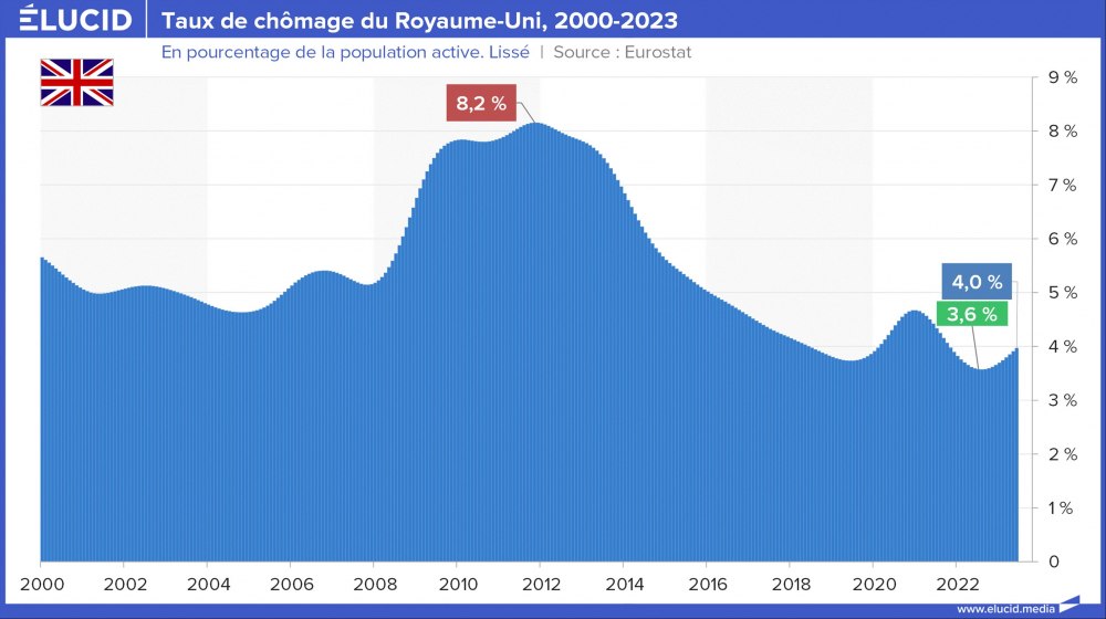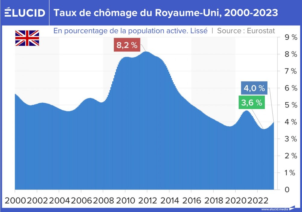 Le Royaume-Uni connaît également un taux de chômage moins important que la plupart des pays européens. Rappelons d’ailleurs que la forte diminution du chômage dans ce pays dans les années 1990 était largement due, selon un rapport de l’OCDE en 2007, à une bascule comptable du chômage vers le régime d’invalidité.
