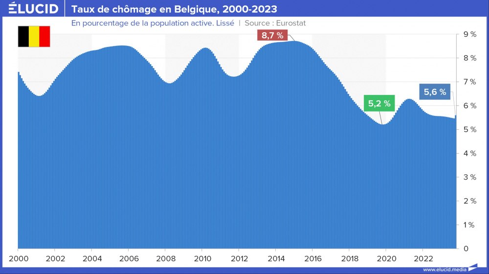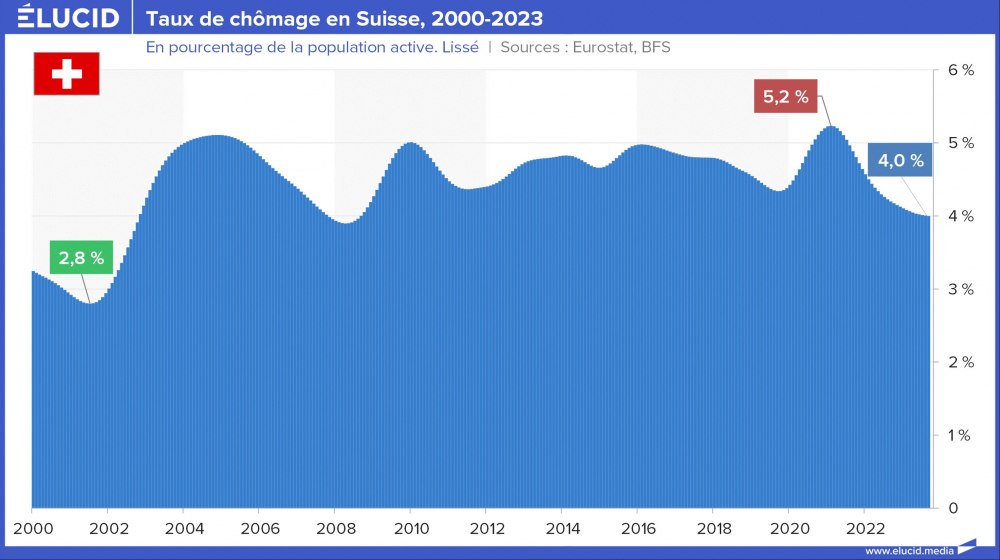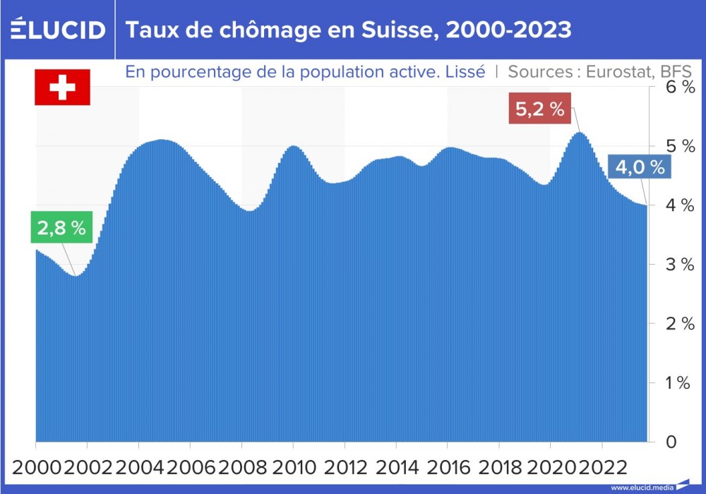 La Belgique a suivi une tendance proche de celle de la France, mais avec un nveau de 2 points inférieurs, ce pays ayant su garder une industrie assez puissante. La Suisse a connu peu d’évolution : même si le chômage a un peu augmenté en 20 ans, il est stable depuis 10 ans à des niveaux de quasi-plein emploi.
