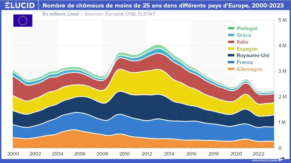 L’Europe se caractérise également par un fort chômage des jeunes. Certains pays tels que, là encore, l’Espagne, la Grèce et l’Italie ont été très fortement frappées, avec des taux de chômage de 40 % à 60 % il y a 10 ans de cela. Ces taux ont été divisés par deux durant la dernière décennie, mais ils restent donc encore situés à 20 et 30 %, ce qui pose toujours de gros problèmes sociaux et politiques dans ces pays.