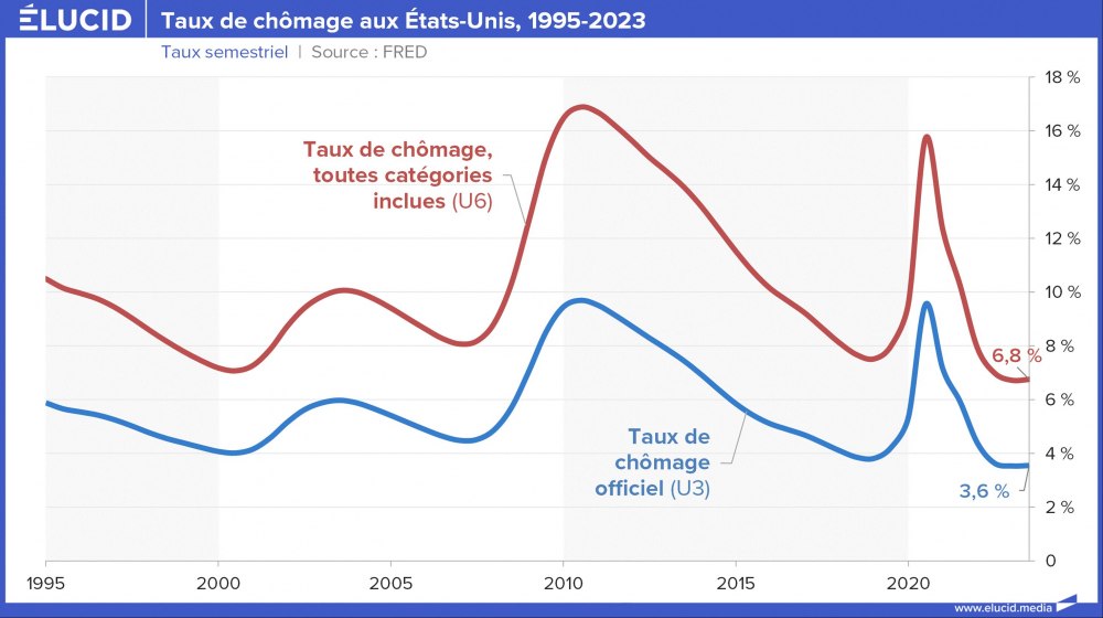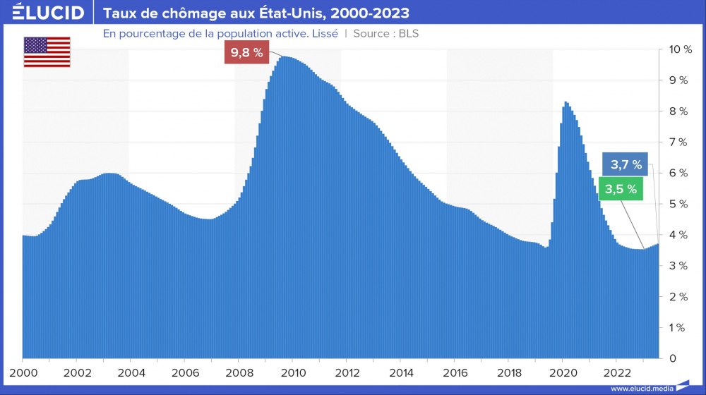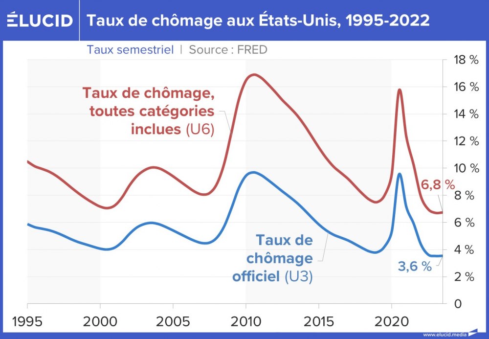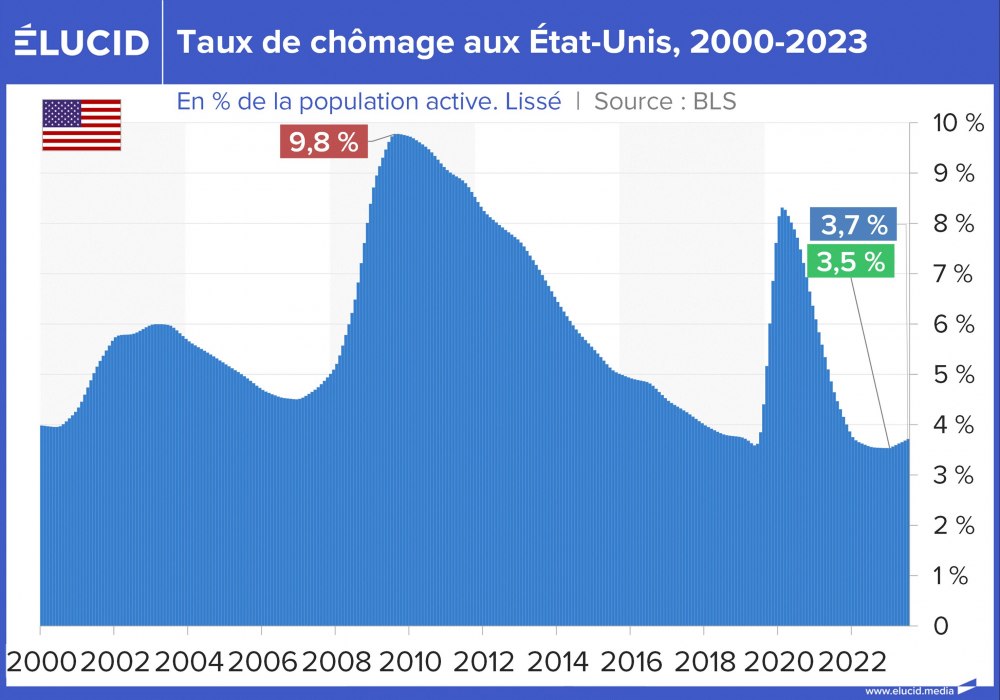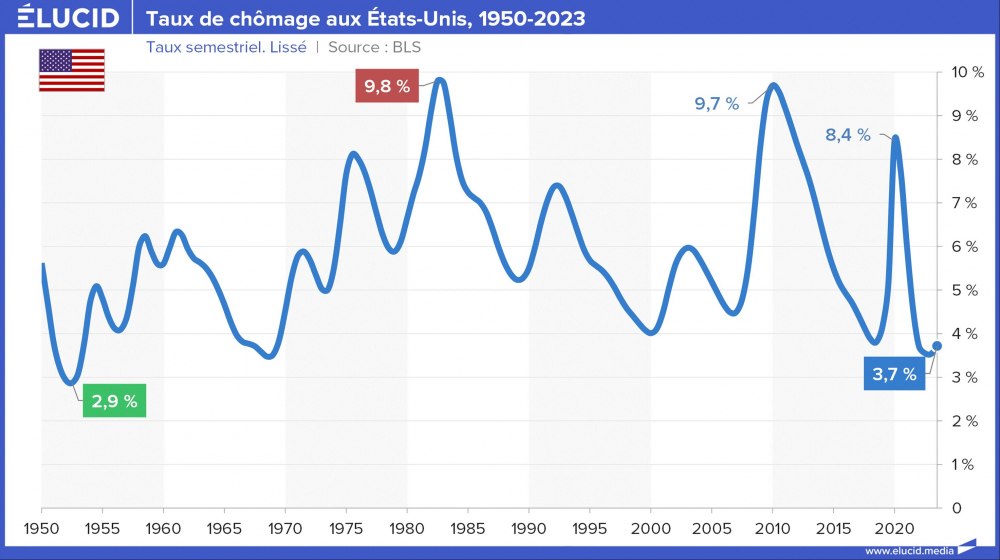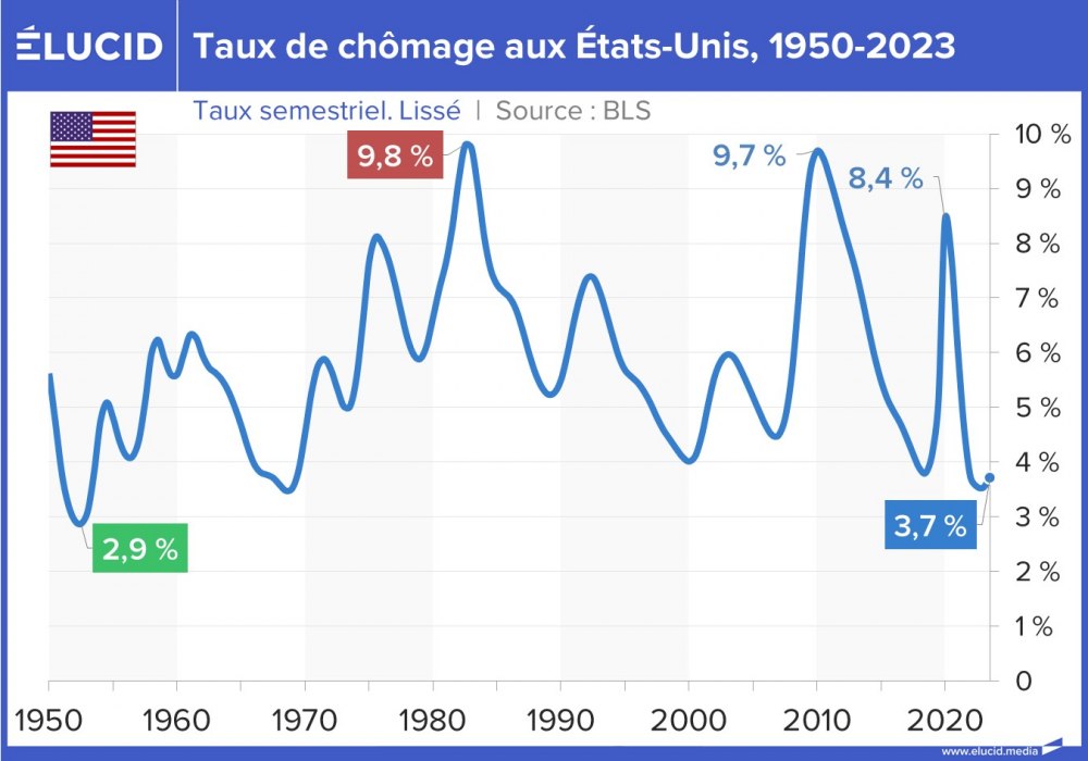 Le taux de chômage des États-Unis sur les 40 dernières années est nettement moins élevé que celui des principales puissances européennes. Le taux de chômage officiel avait baissé sans discontinuer, passant de 10 % en 2009 – au pic de la crise des subprimes – à 3,6 % fin 2019, son plus bas niveau depuis 1969. La crise du Covid a brièvement fait augmenter le taux à 8 %, mais il est revenu à 3,7 % fin 2023.