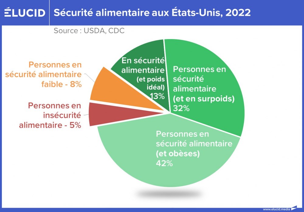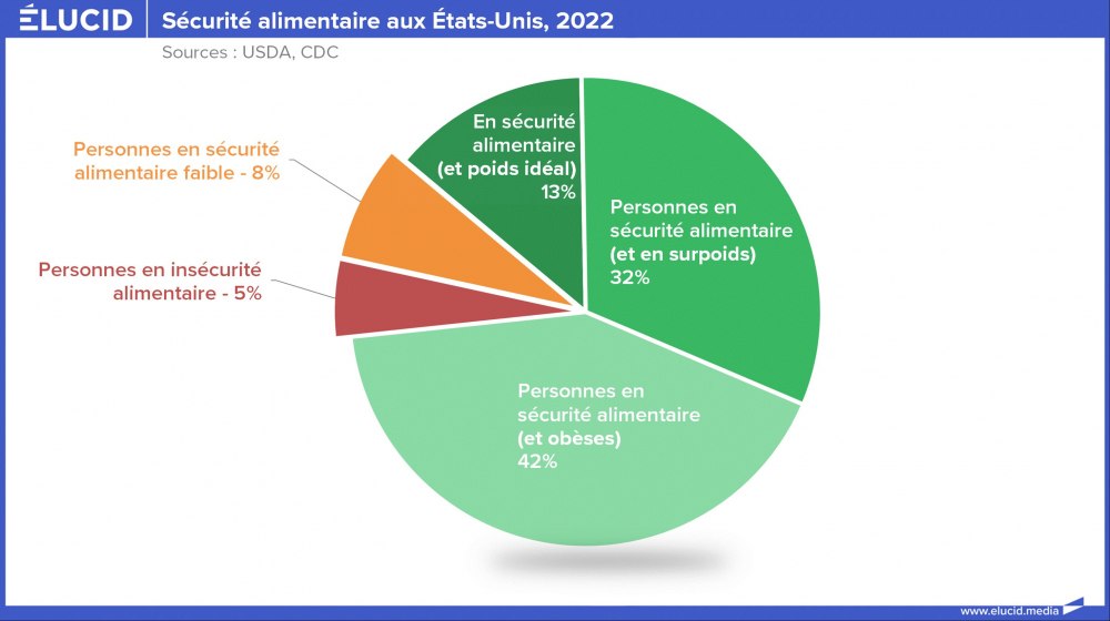 Ceci explique pourquoi 5 % des Américains sont en insécurité alimentaire, et 8 % de plus en faible sécurité alimentaire. Et « en même temps », 42 % des Américains sont obèses et 32 % en surpoids.