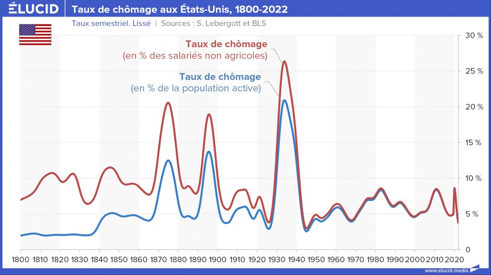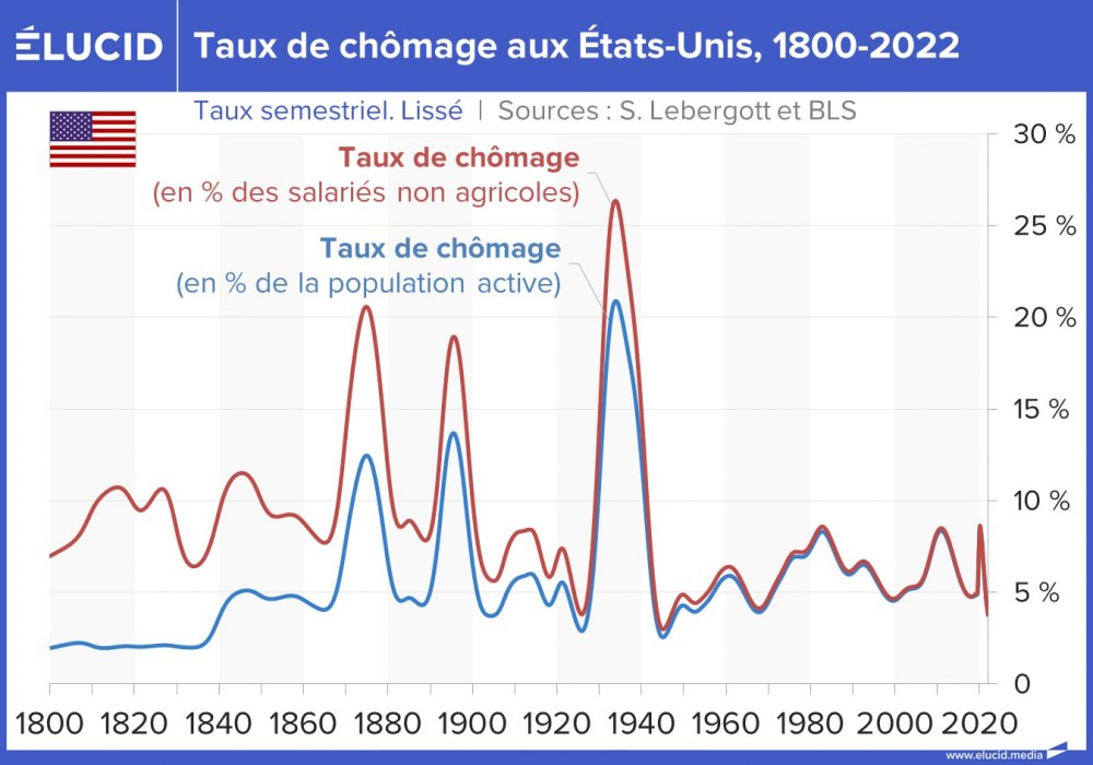 Soulignons enfin que la situation du chômage depuis l’après-guerre est exceptionnelle par sa relative stabilité comparée à la situation des deux siècles précédents. Aucune très grande crise n’est venue frapper l’emploi d’une vaste partie des travailleurs américains.