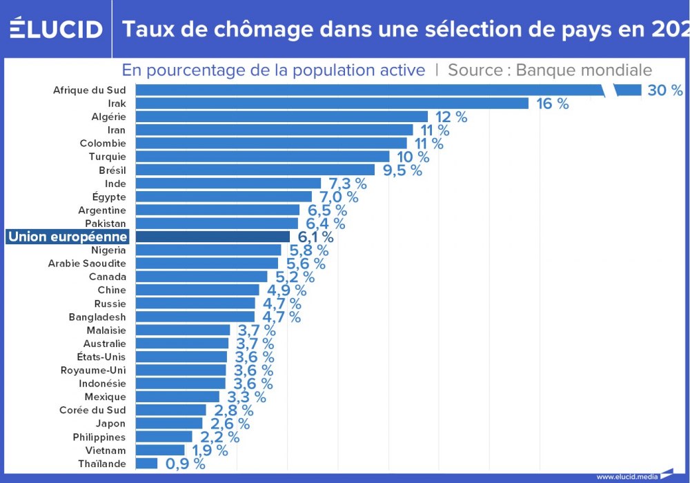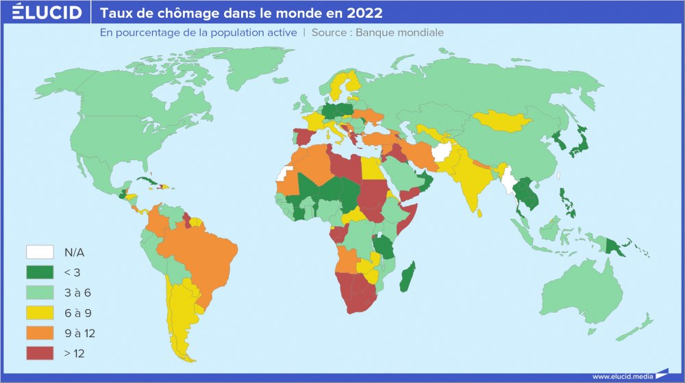 Pour conclure, un panorama mondial montre que le nord est peu touché par le chômage, des États-Unis à la Chine, en passant par l’Europe du Nord et la Russie, contrairement à un sud qui souffre plus, particulièrement du Brésil au Nord et au Sud du continent africain, en passant par l’Europe du Sud.