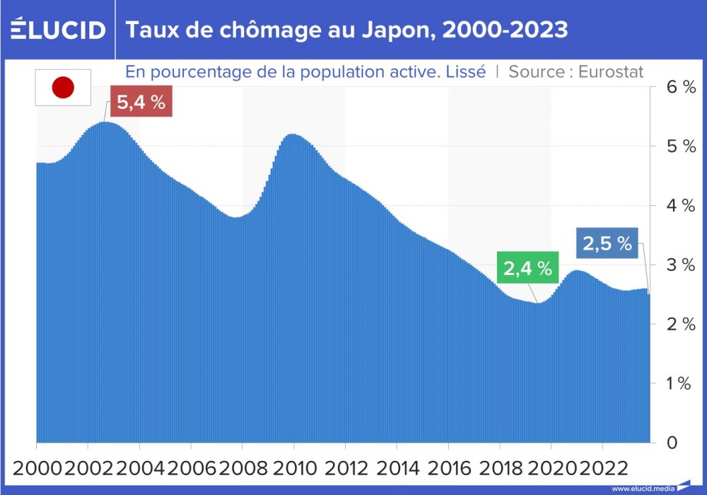 Soulignons enfin que le record de faible chômage dans les grands pays développés est détenu par le Japon, qui affiche un taux de chômage très bas depuis 40 ans. Il est intéressant de noter qu’une telle situation n’est finalement pas toujours très désirable, car elle résulte en l’espèce de sa très faible démographie qui entraîne une pénurie de main-d’œuvre, ainsi que de lourds problèmes au niveau de l’activité économique et du financement des besoins des séniors.