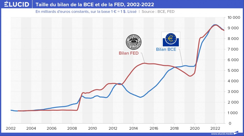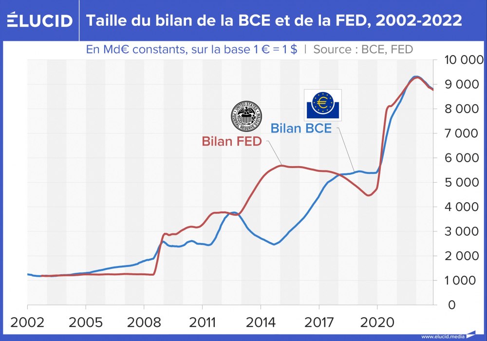 Conséquence : des deux côtés de l’Atlantique, une inflation d’ampleur historique s’est déclarée, et les deux banques centrales cherchent aujourd’hui à réduire leurs bilans, mais doivent procéder très graduellement, sous peine de déstabiliser les marchés financiers (comme à la fin de 2019).