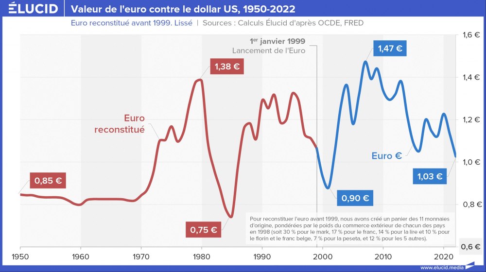 Si bien qu’on remarque que, sur la longue durée, le taux de change entre l’euro et le dollar est relativement invariable : il était le même le 28 novembre 2022 que ce qu’il était le 28 novembre 1986. Pourquoi ? Parce que les deux monnaies baissent de concert. Elles se dévaluent en même temps, sur la base d’une création monétaire équivalente. C’est pourquoi le fait de les mesurer l’une contre l’autre ne révèle pas d’écart, mais un taux relativement constant sur la durée, ce qui masque leurs dévaluations respectives.