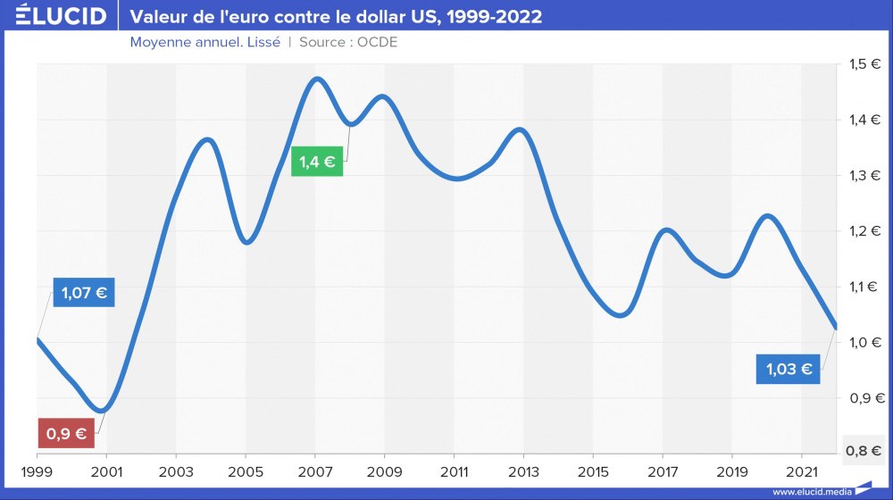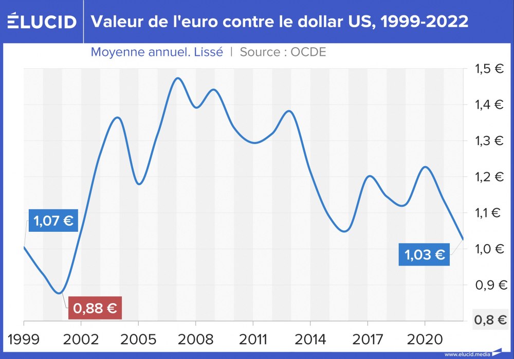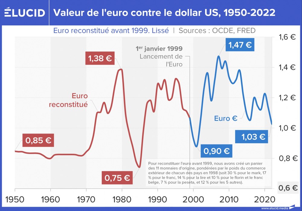 Juste après sa création, le 1er janvier 2002, l’euro partait très fort. Il a entamé une appréciation qui l’a vu passer de 0,89 dollar en janvier 2002 à 1,57 le 25 avril 2008. Durant ces années, le dollar se dévaluait en raison d’une bulle de dette record stimulée par des taux d’intérêt restés très bas de 2000 à 2005, puis à nouveau en 2008. Pour la zone euro, cette époque était marquée par une doctrine de rigueur budgétaire qui représentait une alternative par rapport aux États-Unis, et par une Banque centrale européenne forte.