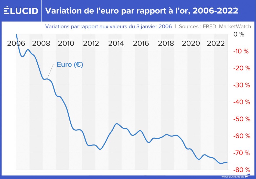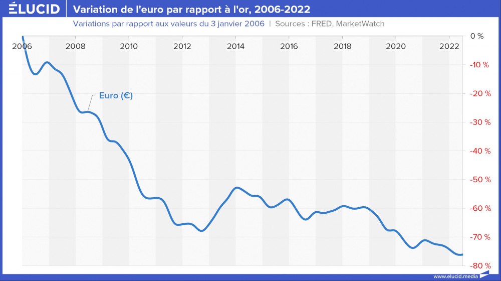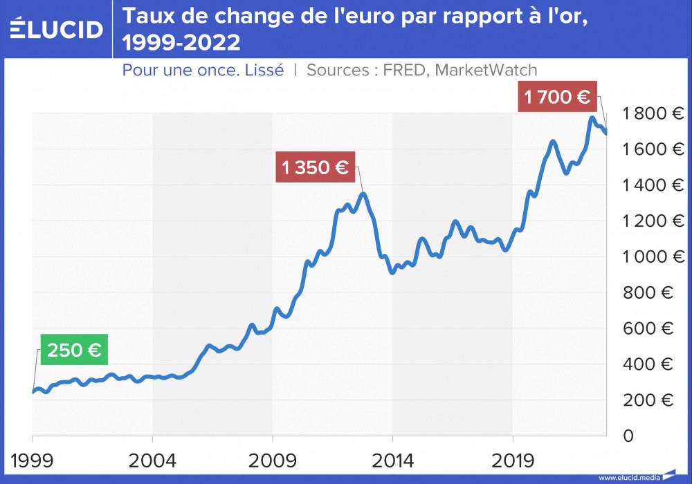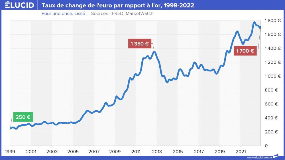 La meilleure façon de mesurer les effets de cette politique de dévaluation est d’observer l’euro non pas contre le dollar, mais contre l’or. Et le graphique est parlant : il faut quasiment 6 fois plus d’euros aujourd’hui pour acheter la même once d’or qu’il y a 23 ans. L’or, lui ne ment pas, car il n’a pas de banque centrale pour le débaucher.