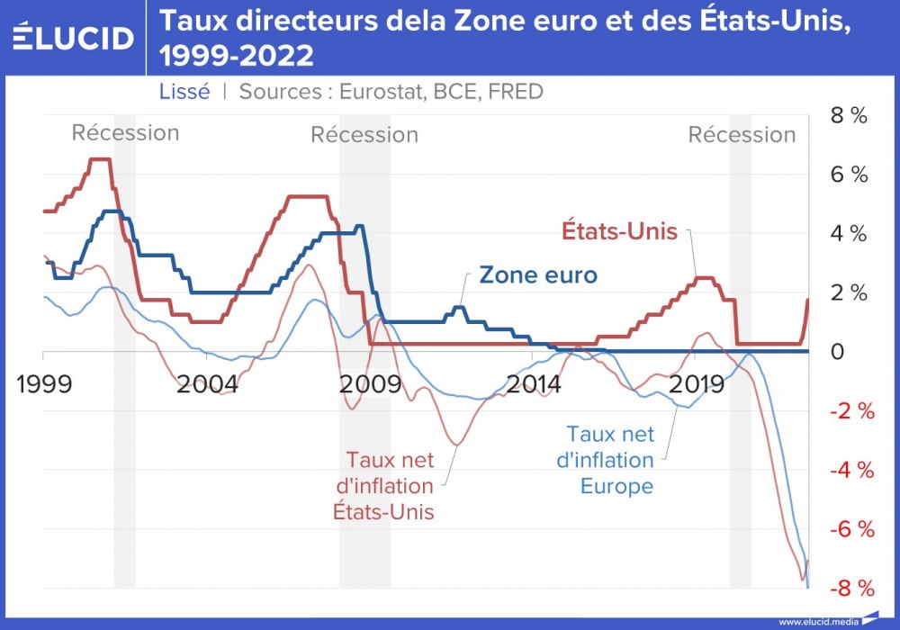 La BCE a perdu le contrôle des choses, et la réalité la rattrape, l’inflation dépassant 8 % en mai 2022. Le 9 juin 2022, elle annonce une timide hausse de son taux directeur pour le mois suivant, les passant de 0 % à 0,25 %, ce qui est dérisoire alors qu’elle anticipe une inflation est de près de 7 % pour 2022 et commence son communiqué de presse par les mots « La forte inflation est un défi majeur pour chacun d’entre nous ».