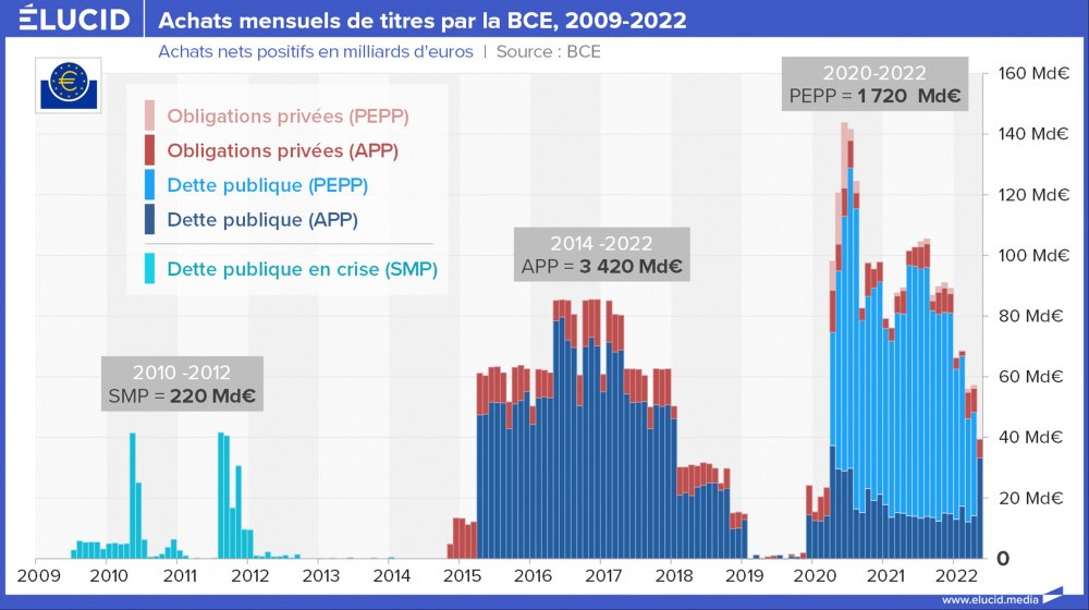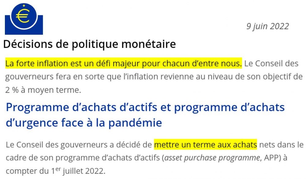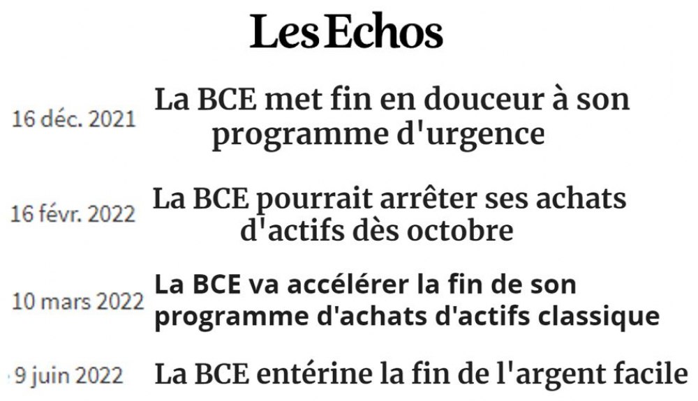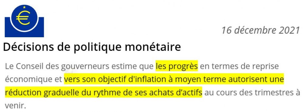 Ainsi, le 16 décembre 2021, la BCE annonce qu’elle va réduire ses achats d’actifs en raison des « progrès […] vers son objectif d'inflation à moyen terme » L’inflation était alors déjà à 5 %, gros « progrès » si l'on s'en tient à l'objectif de la BCE de passer de 0 % à 2 %. Au même moment, elle annonce la réduction immédiate du programme PEPP et sa fin pour mars 2022. Elle indique toutefois que pour ne pas serrer trop fortement les marchés, elle allait augmenter ses achats au titre de l’APP jusqu’à « 40 milliards d’euros au deuxième trimestre 2022 et de 30 milliards au troisième trimestre. À compter d’octobre 2022, le Conseil des gouverneurs continuera d’effectuer des achats nets d’actifs en vertu de l’APP à un rythme mensuel de 20 milliards d’euros pendant aussi longtemps que nécessaire pour renforcer les effets accommodants des taux d’intérêt directeurs. »