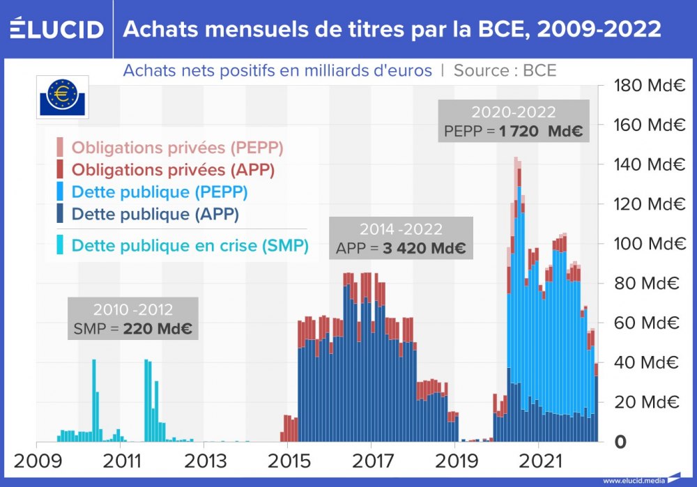 La BCE a réalisé cette création monétaire par le biais de deux programmes d’achats, qui ont augmenté la masse monétaire. Le premier, appelé Programme d’Achats d’Actifs (APP), a commencé fin 2014 et n’a pas cessé depuis lors ; il a concerné jusqu’à 80 milliards d'euros (Md€) d’achats mensuels en 2015 et 2016, et le total actuel dépasse 3400 milliards. Le second est le Programme d’achats d’urgence face à la pandémie (PEPP) qui a commencé en 2020 pour faire face aux énormes besoins financiers des États ; il a concerné jusqu’à 140 Md€ d’achats mensuels, et le total actuel dépasse 1700 milliards d’euros.