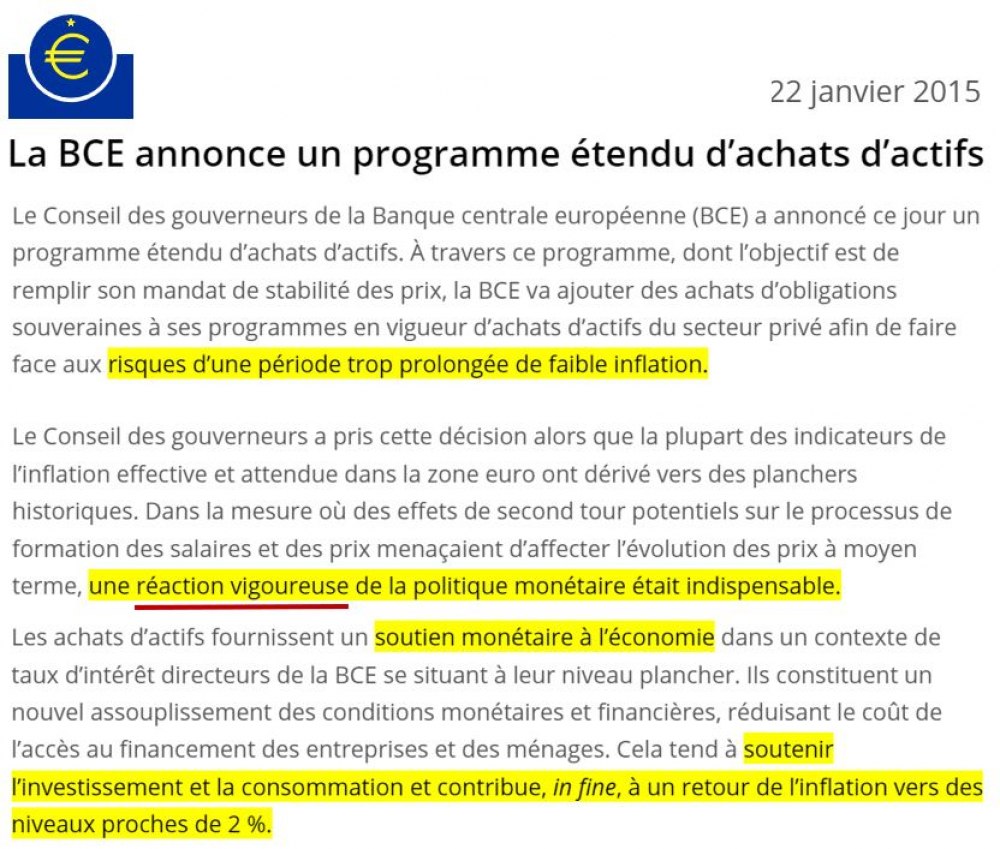 Retour en 2014 : la France se remet difficilement de la crise de 2009-2010 suivie de la crise de la zone euro de 2012, qui avait cessé avec le début des achats de dette publique par la BCE suite aux fameux « quoi qu’il en coûte » et achats de dette « sans limite » lancés par Mario Draghi en juillet et septembre 2012. Comme nous l’avons vu dans cet article, cette situation économique a entrainé en 2014 une très forte baisse des prix de l’énergie, le tout ayant conduit à une déflation, c’est-à-dire une inflation négative (très légèrement fin 2014). En août 2014, le Premier ministre Manuel Valls lançait même une « alerte à la déflation ». La BCE doit agir, et crée donc l’APP fin 2014. Et elle indique alors :