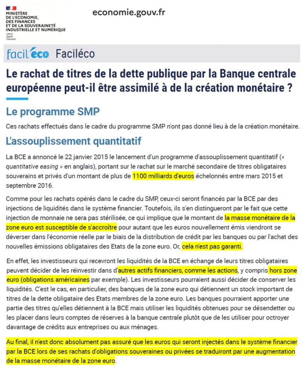 En réponse aux inquiétudes suscitées par une telle création monétaire, les politiques se sont voulus rassurants. On peut ainsi lire sur le site du ministère de l’Économie ces propos de l’époque qui ont assez mal vieilli : « Il n'est donc absolument pas assuré que les [1100 milliards d’]euros qui seront injectés dans le système financier par la BCE lors de ses rachats d'obligations souveraines ou privées se traduiront par une augmentation de la masse monétaire de la zone euro », car ils risquent d’aller gonfler le prix des actions (les millionnaires disent merci à la BCE) ou d’aller plutôt gonfler l’inflation aux États-Unis (les Américains ne disent pas merci à la BCE, mais comme la Fed a fait pareil, les Européens ont aussi reçu en retour de la monnaie excédentaire).