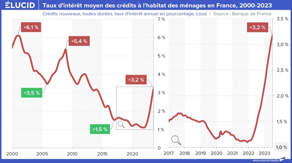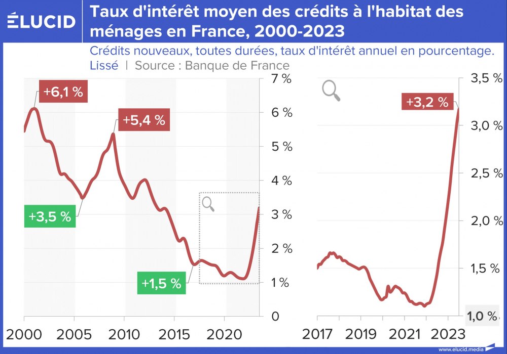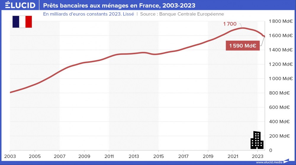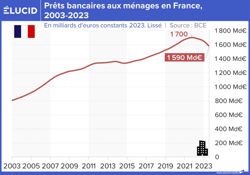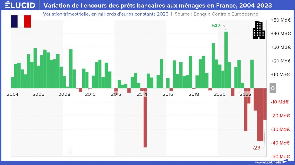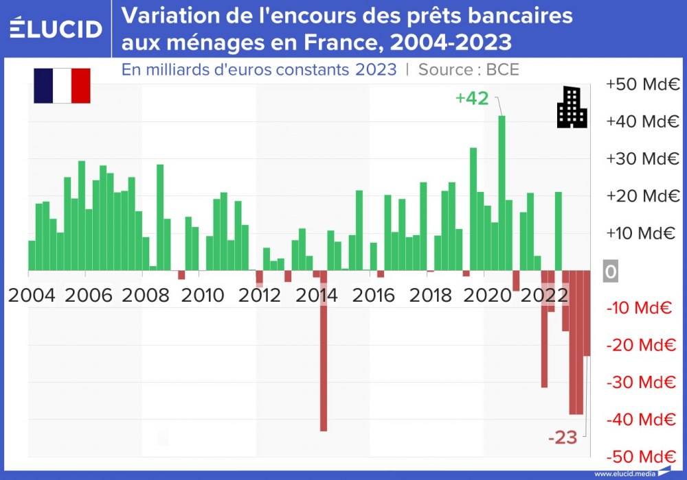 La crise du Covid avait stoppé la croissance continue de l’endettement des entreprises et des ménages en France et en Europe depuis 20 ans. La hausse des taux initiée en 2022 commence à faire sentir ses effets, avec désormais une baisse notable des encours de crédits. S’il est plutôt bon de sortir d’un dangereux mécanisme de surendettement, il est problématique que rien n’ait été fait politiquement pour prévoir une compensation à la fin de ce soutien à l’économie, comme développer une politique industrielle volontariste. Les effets négatifs de cette situation devraient s’en faire sentir dans les prochains trimestres.