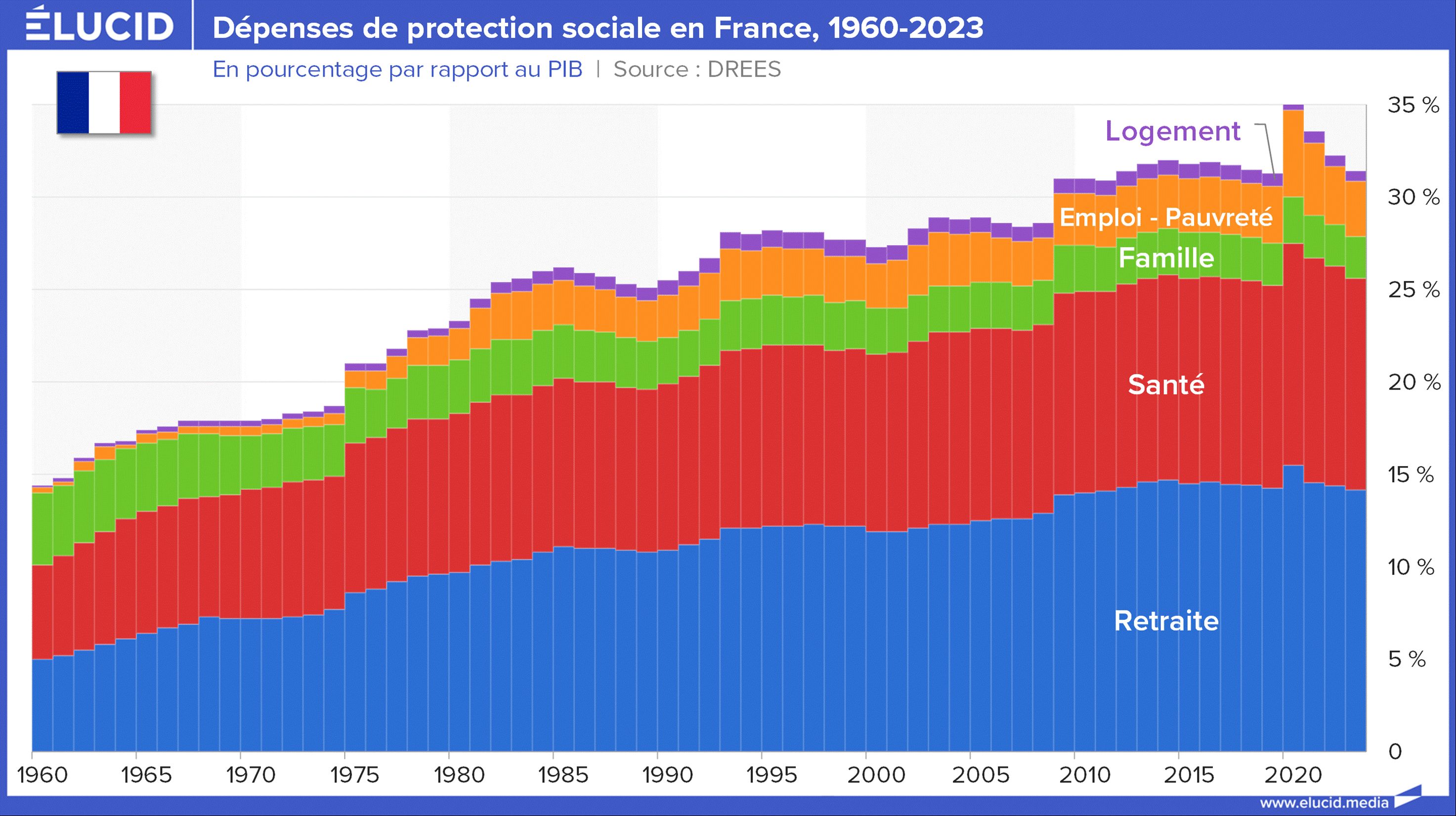En ce qui concerne spécifiquement les dépenses de protection sociale – donc l’assurance vieillesse, l’assurance maladie, l’assurance chômage, les allocations familiales et les allocations sociales – environ 80 % concernent uniquement les dépenses de retraite et de santé. Les autres prestations, souvent stigmatisées sous le terme d’« assistanat », forment une part bien plus modeste du total.
