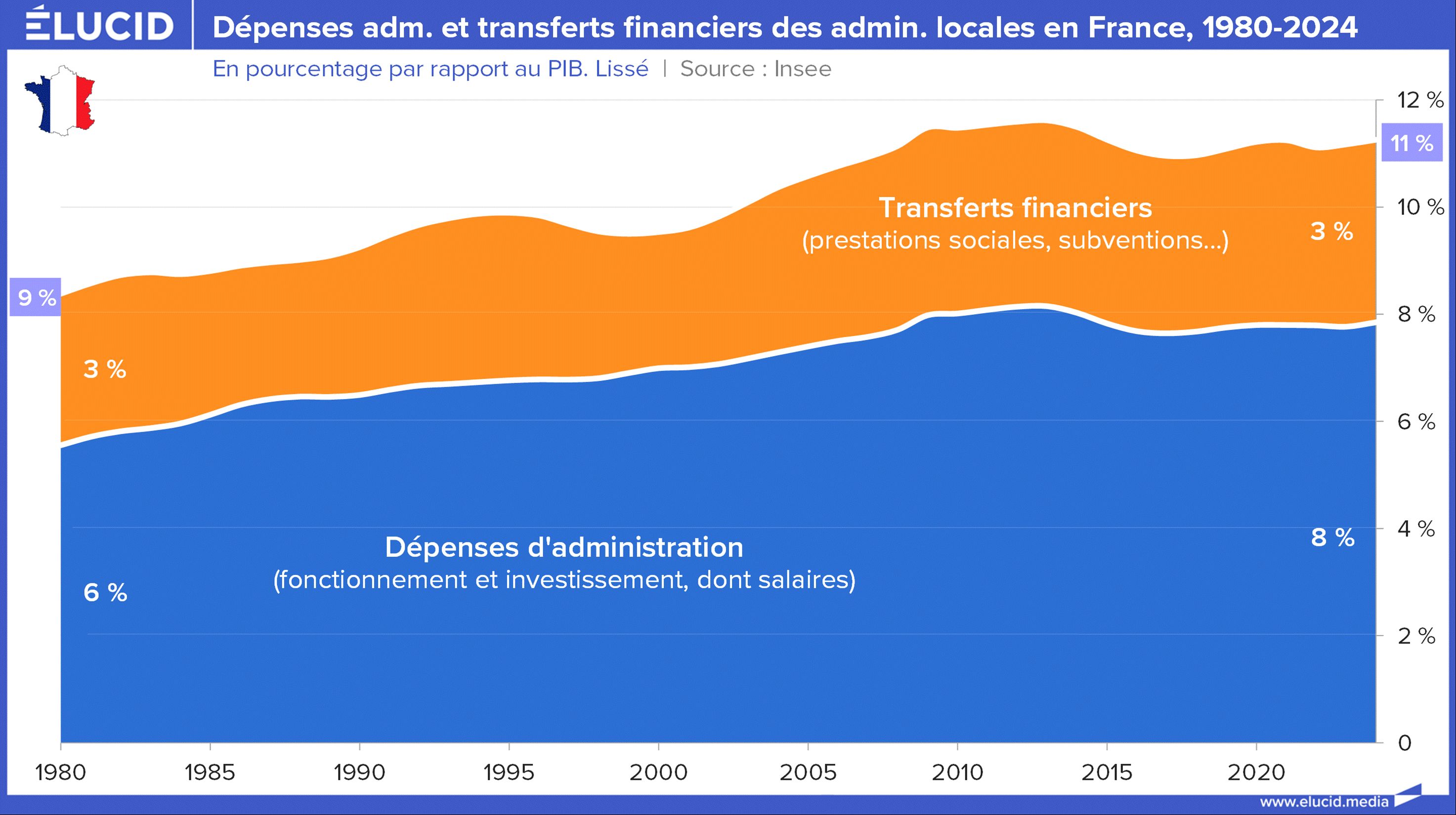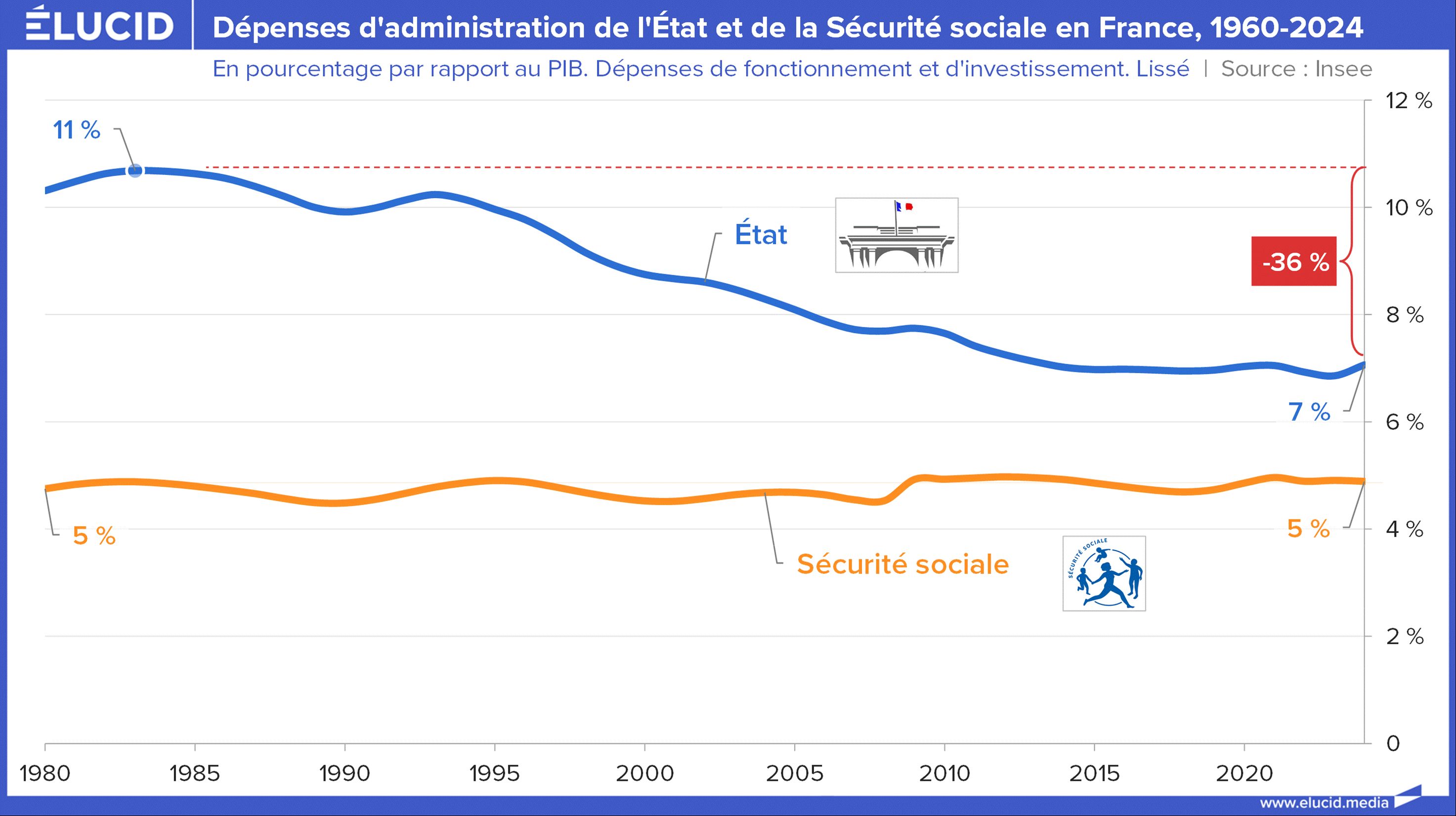 Nous avons ici réalisé pour cet article une analyse approfondie qui permet de scinder les dépenses publiques en ces deux grands types. Au final, au niveau de l’ensemble des administrations publiques, il apparaît que les dépenses d’administration sont restées parfaitement stables depuis un demi-siècle : en 2024, elles représentaient 23 % du PIB — exactement le même niveau qu’en 1975.