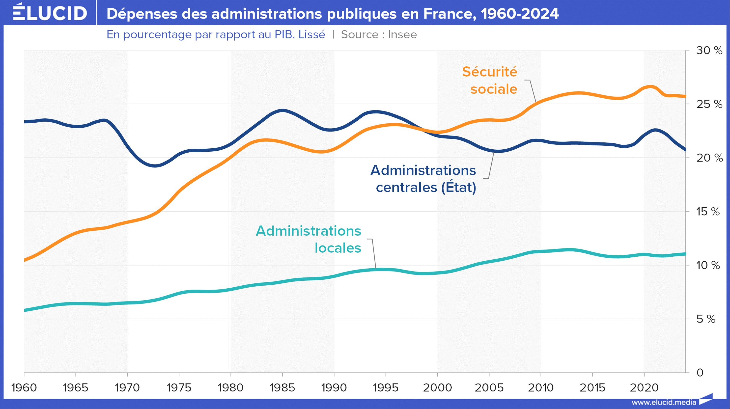 Depuis 1960, la hausse des dépenses publiques provient presque entièrement de l’explosion des dépenses de Sécurité sociale. Les dépenses des administrations centrales et locales, elles, ont très peu évolué depuis 1960 ; elles restent aujourd’hui proches de leur niveau du milieu des années 1980.