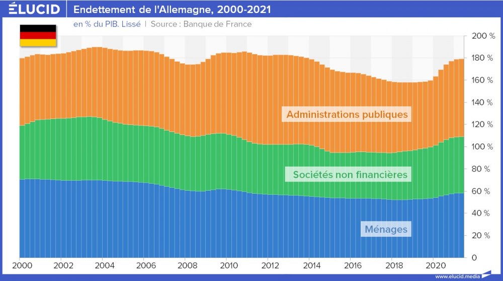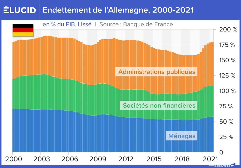 Au premier trimestre 2000, la dette totale de l’Allemagne était de 180 % de son PIB, un niveau supérieur au niveau moyen de la zone euro, qui était de 168 % du PIB au même moment. Après une baisse quasiment ininterrompue jusqu’à 157 % du PIB en 2018, elle s’établit à 181 % du PIB au troisième trimestre 2021, son plus haut niveau des deux dernières décennies.