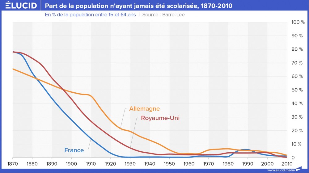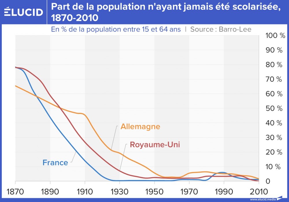 Le XIXe siècle est le siècle de l’alphabétisation de masse. La France passe d’un taux de scolarisation d’à peine plus de 20 % en 1870 à presque 100 % en 1925. Initialement en retard sur l’Allemagne, le développement éducatif français a été plus rapide et homogène : dès 1885, le nombre de Français sans aucune forme de scolarisation tombe en dessous du taux allemand. Chose remarquable : alors que la France ne dispose pas de ressources charbonnières ou de flotte de commerce aussi importante que le Royaume-Uni, le taux de scolarisation français lui a été constamment supérieur.