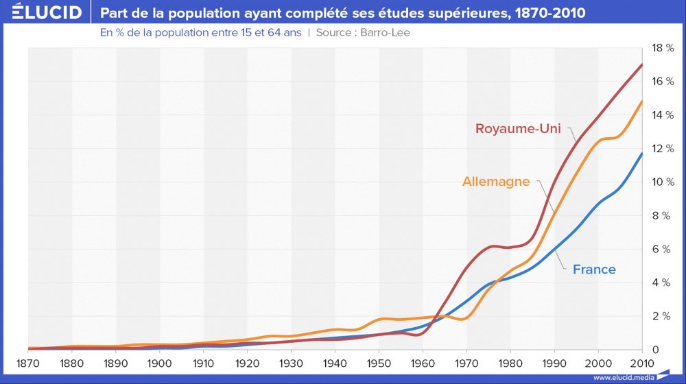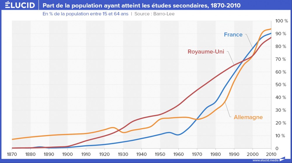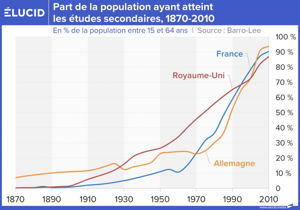 Le développement des études secondaires (collège-lycée) et supérieures (université) s’inscrit également dans le schéma suivi par les niveaux d’éducation primaire. D’abord en retard par rapport à ses voisins européens, la France a massivement investi pour rattraper son retard à partir des années 1960. En 2010, un peu plus de 90 % de la population française avait atteint les études secondaires, un taux un peu inférieur au taux allemand (94 %), mais supérieur au taux britannique (87 %).