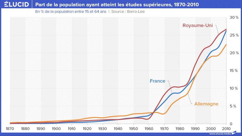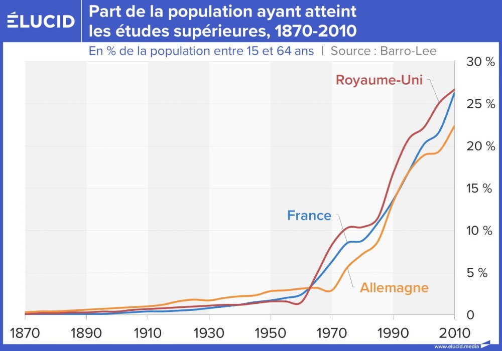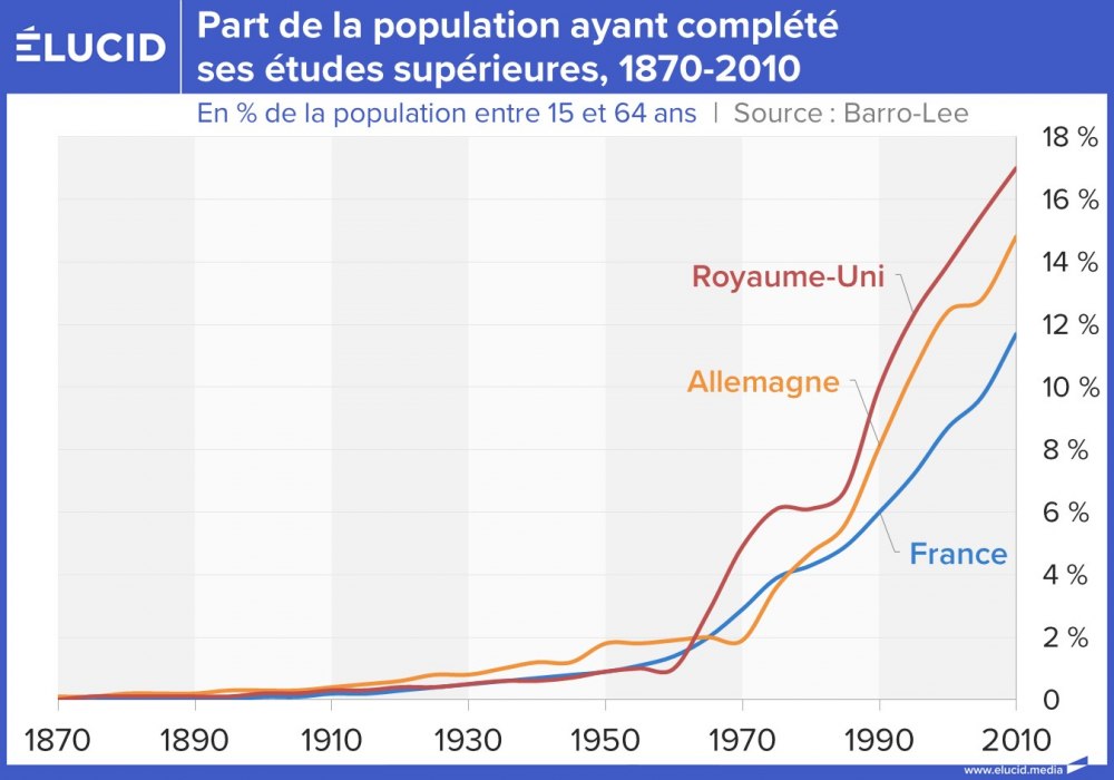 Cet effort français pour universaliser au maximum l’accès à l’éducation se constate particulièrement pour les études supérieures où la France a presque rejoint le taux britannique : environ 26 % de la population a atteint les études supérieures contre seulement 22 % en Allemagne.