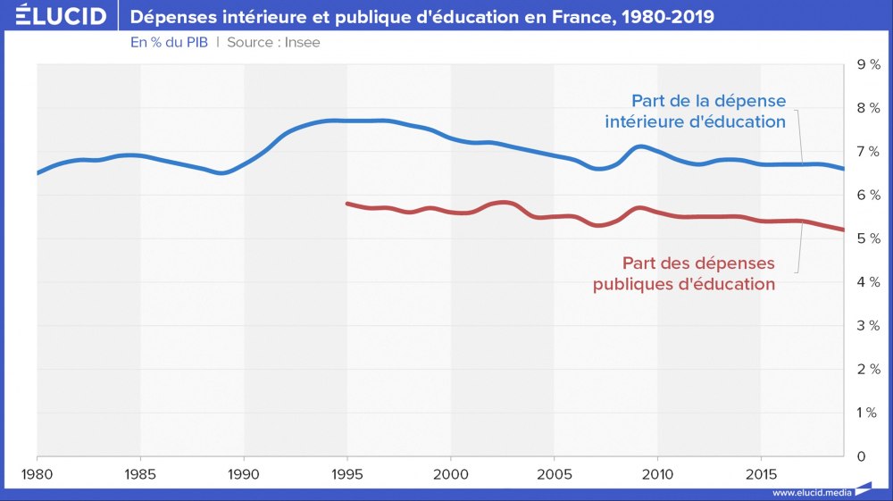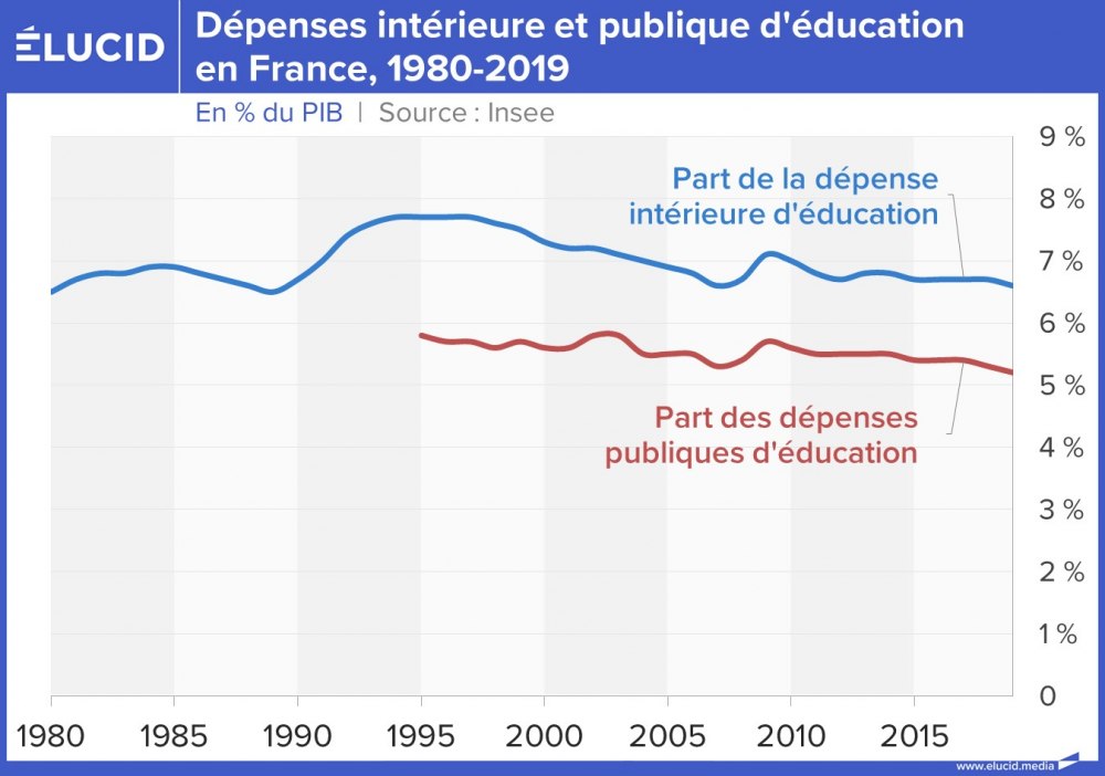 Avec la mise en place de politiques de rigueur budgétaire dans le cadre de l’intégration européenne (signature du traité de Maastricht en 1992), on constate que les dépenses d’éducation en termes de parts dans le PIB ont eu tendance à reculer à partir de 1996. Cette tendance s’est poursuivie sous le quinquennat d’Emmanuel Macron. Les dépenses publiques d’éducation ont reculé de 5,4 à 5,2 % du PIB entre 2017 et 2019 tandis que la dépense totale (publique et privée) reculait de 6,7 à 6,6 %.