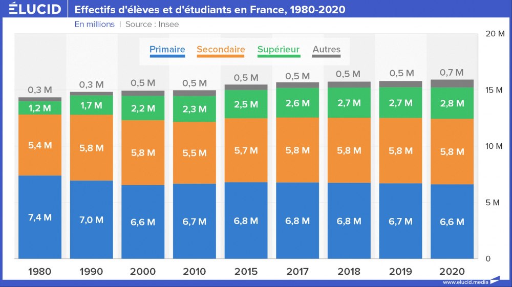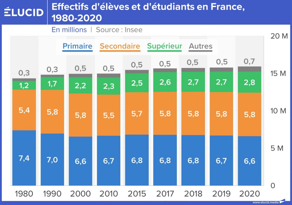 Pourtant, depuis les années 1990, les effectifs scolaires ont continué à progresser en volume de près de 1 million d’individus pour atteindre le chiffre de 16 millions en 2019 (primaire, secondaire et études supérieures).