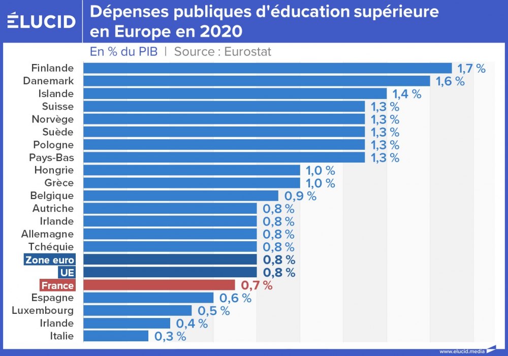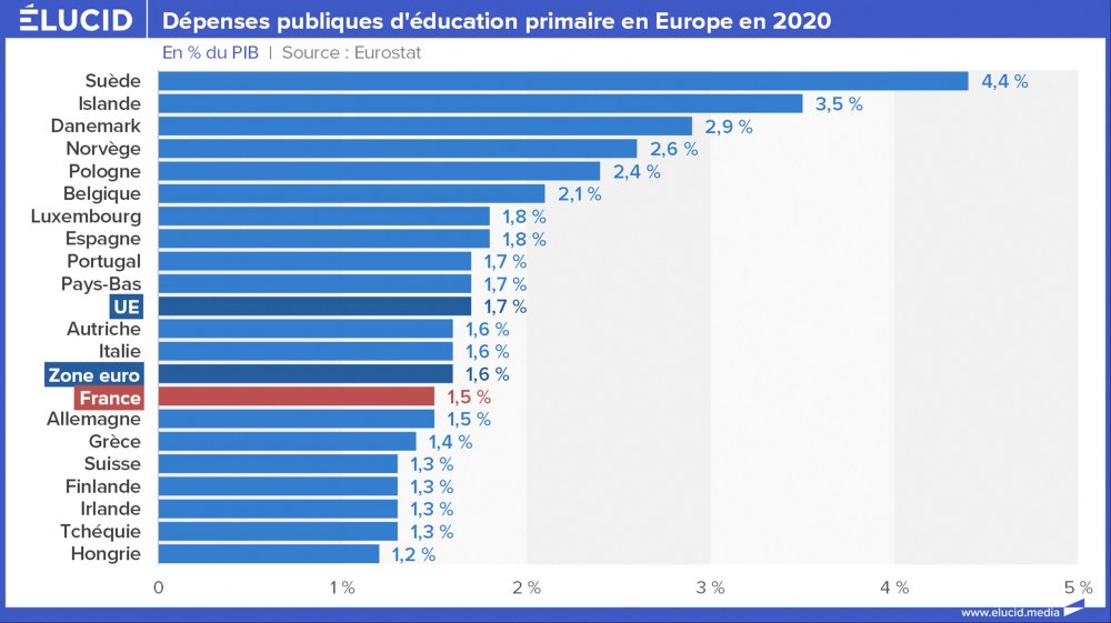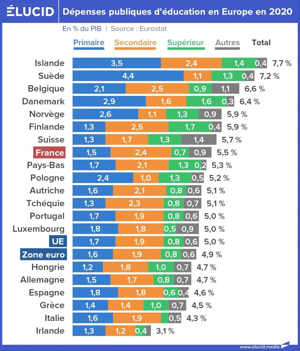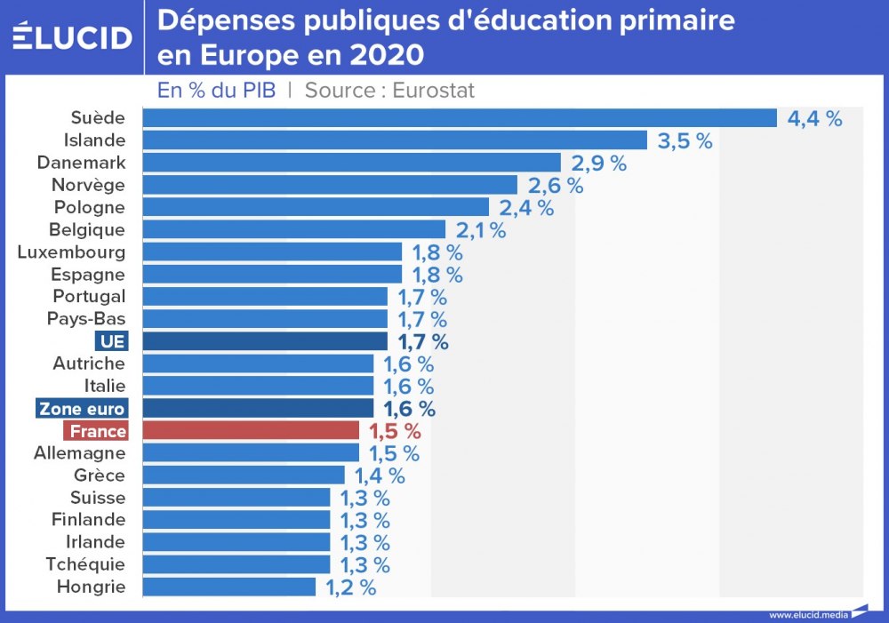 En revanche, en termes d’éducation primaire et supérieure, les dépenses publiques françaises se retrouvent en queue de peloton. Pour les dépenses d’éducation primaire, la France évolue à la 15e place de l’UE (sur 27) et est 23e pour les dépenses publiques dans l’éducation supérieure.