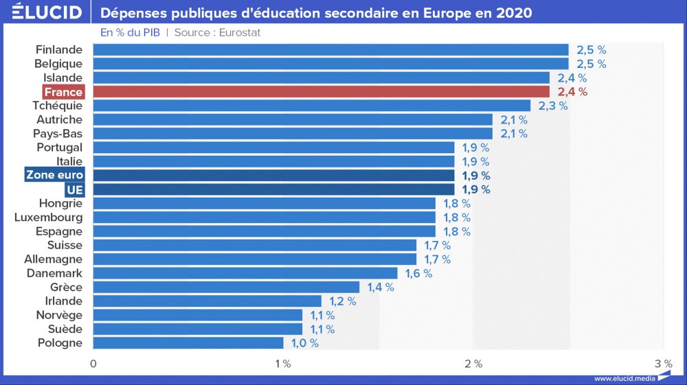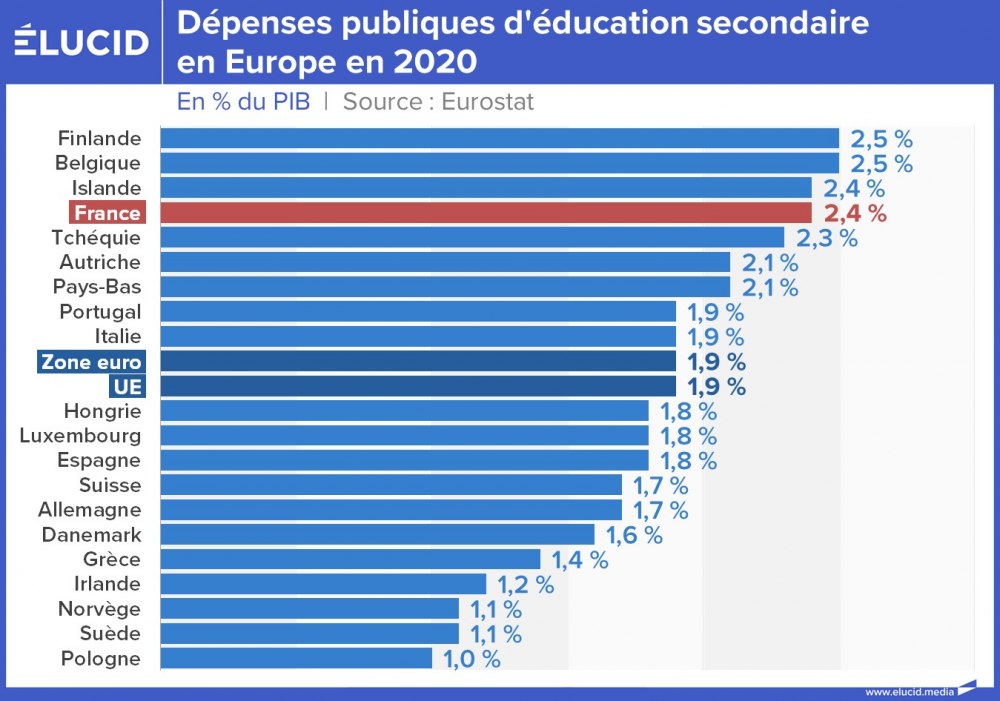 Si l’on compare la France à ses voisins européens, il apparaît que les dépenses publiques à destination de l’éducation secondaire sont relativement élevées : la France occupe le 3e rang de l’Union européenne avec 2,2 % du PIB consacré aux études secondaires.