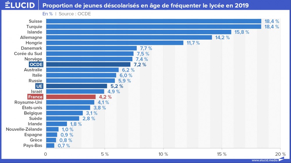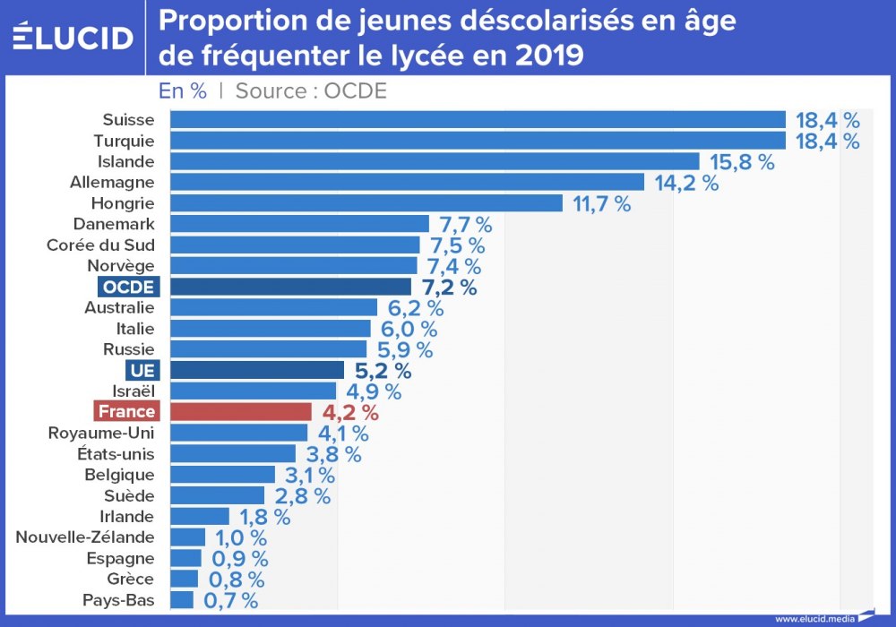 Corrélativement la France peut se targuer d’un très faible taux d’exclus du système d’enseignement secondaire supérieur (lycées) avec moins de 4 % d’une classe d’âge (proche des taux finlandais et suédois). Ce taux est inférieur à la moyenne de l’UE, mais aussi à ce qui s’observe en Allemagne (14 %) et même au Danemark (8 %), souvent mis en avant pour son système éducatif.