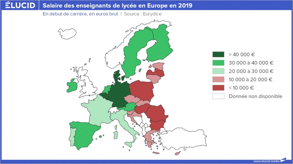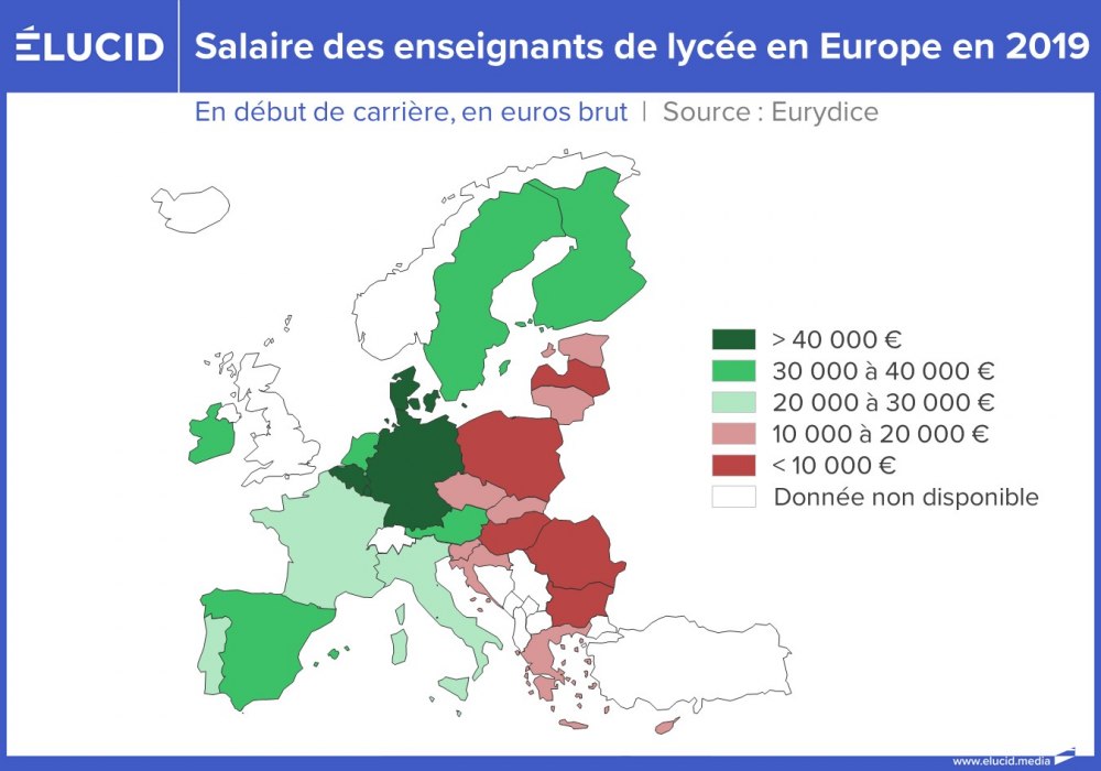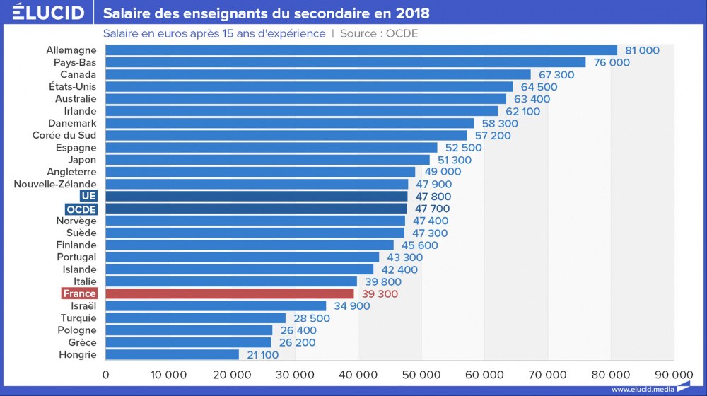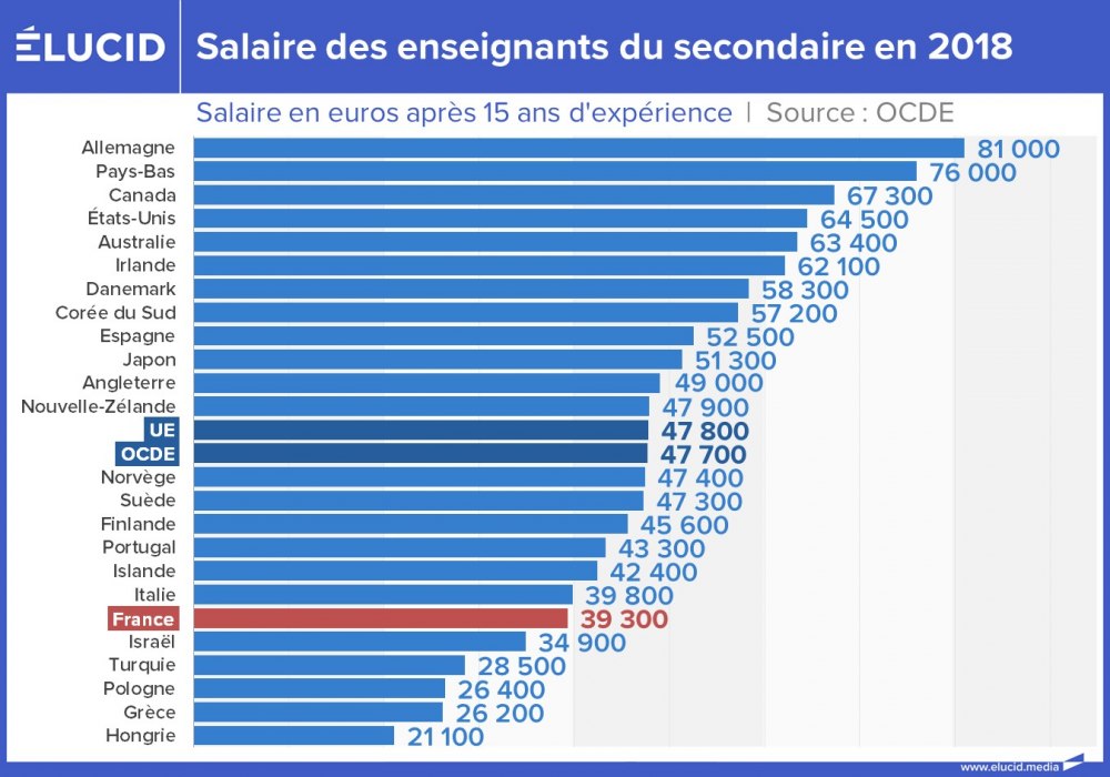 Un autre levier sur lequel joue l’État pour limiter les dépenses publiques concerne le salaire des professeurs, qui même dans le secondaire est très inférieur à celui de ses proches voisins à l’exception de l’Italie. En France, un enseignant au lycée en début de carrière touche en moyenne 29 000 € par an contre 33 000 € en Belgique, 34 000 € en Espagne et 57 000 € en Allemagne.