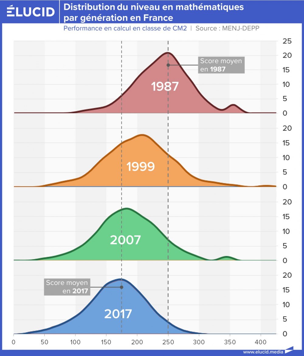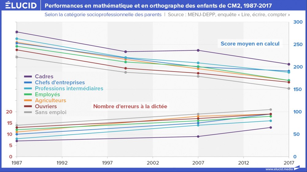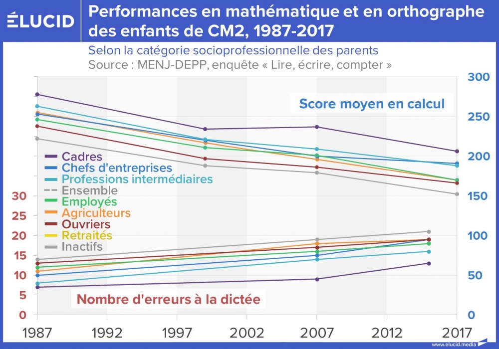 L’enquête « lire, écrire, compter » du ministère de l’Éducation nationale mesure les performances en dictée et en calcul des élèves de CM2 depuis 1987. Or ces deux indicateurs accusent une dégradation importante puisque dans l’ensemble, le nombre de fautes par dictée est passé de 11 à 18 entre 1987 et 2015, tandis que le score moyen en calcul passait de 250 à 176 entre 1987 à 2017.