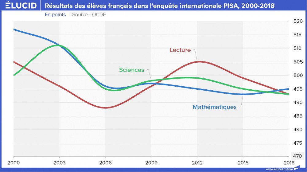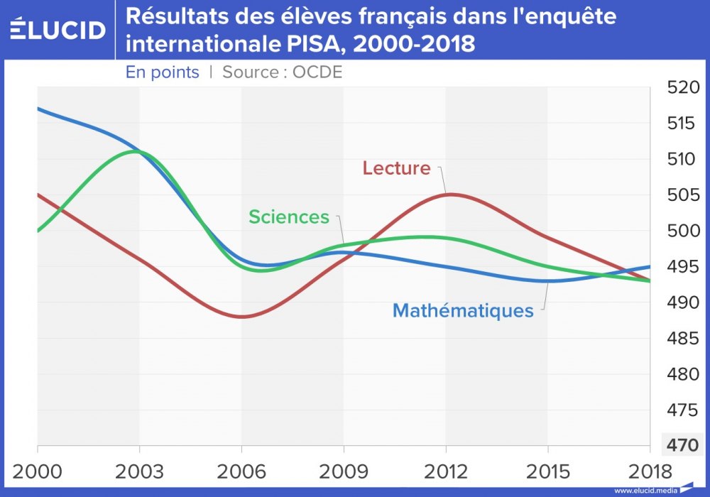 Au niveau international, l’enquête PISA, réalisée par l’OCDE tous les 3 ans, permet de mesurer les performances scolaires d’un ensemble de pays, mais aussi de comparer les résultats d’un même pays au cours du temps. Là aussi, semble se dessiner un déclin des performances éducatives de la France, en particulier en mathématiques et sciences. Pour ces deux matières, le score français est passé de 511 en 2003 à environ 493 en 2018.