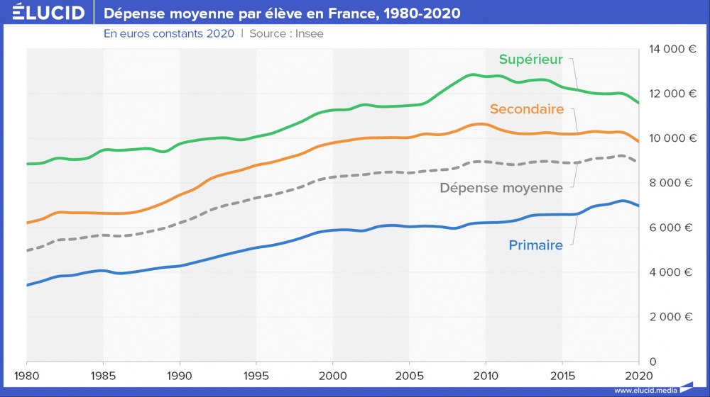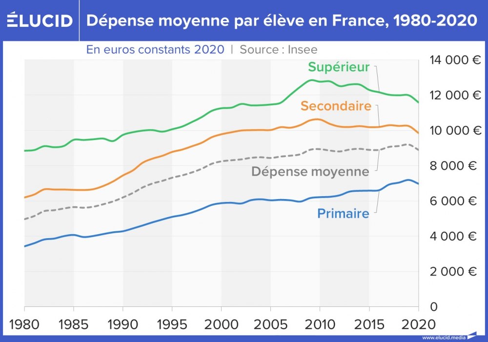 Cependant, on constate un certain désinvestissement de la part des gouvernements successifs dans le système éducatif français, mesuré par les faibles dépenses publiques qui lui sont consacrées. Les enquêtes internationales viennent aussi mesurer une baisse de niveau scolaire de la part des élèves français.